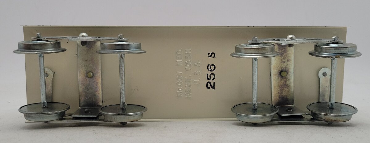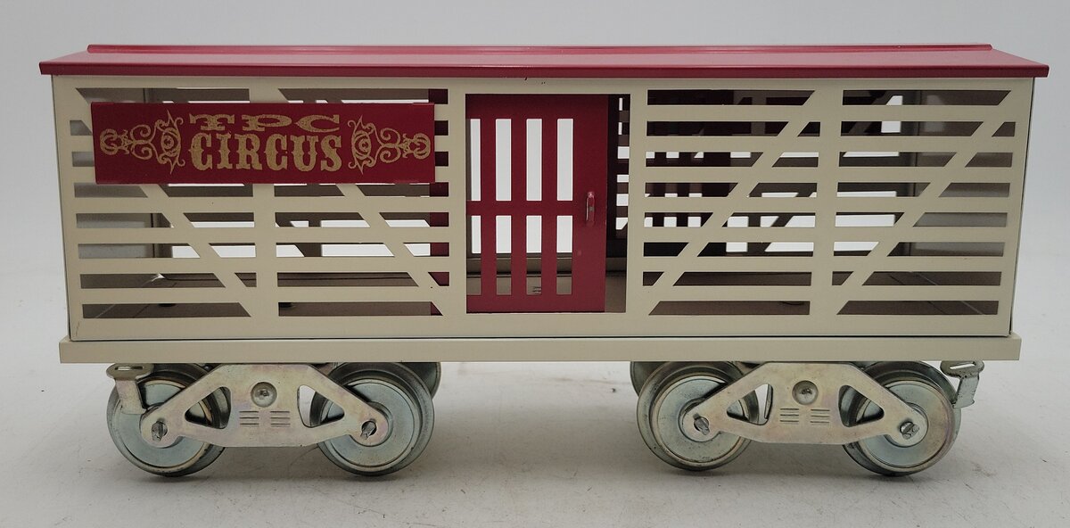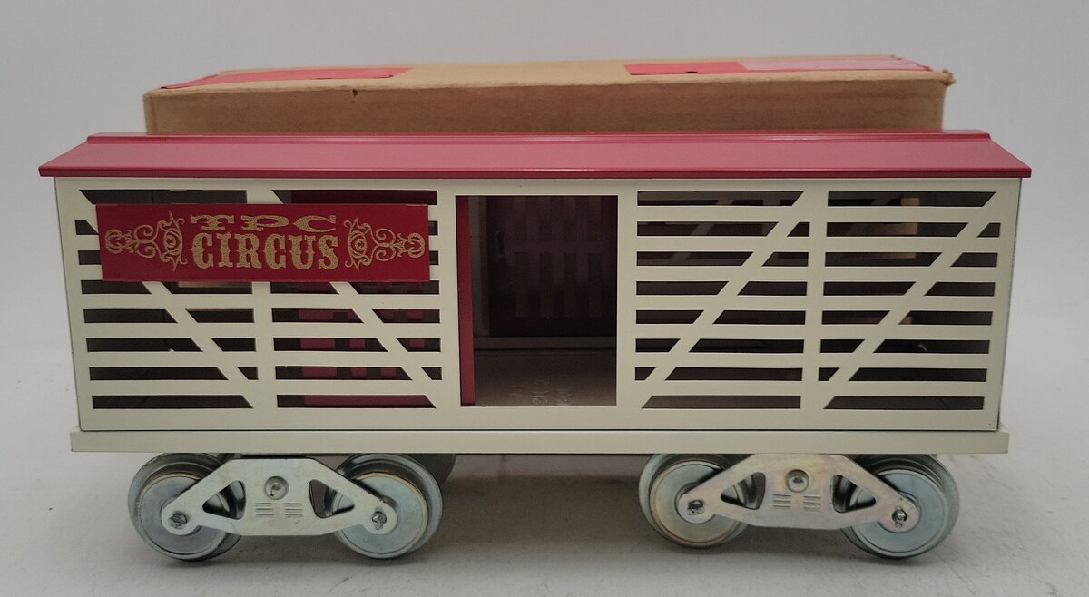 Here is a McCoy 256PS Standard Gauge TPC Circus Animal Car. This boxcar features sliding doors, tinplate construction, hook couplers, and metal wheels. It measures approximately 12 inches long.