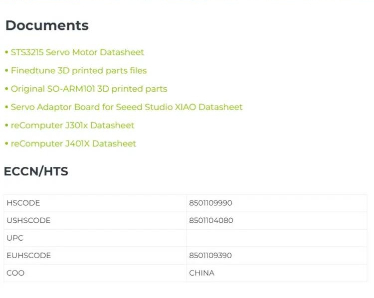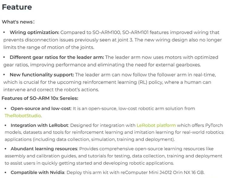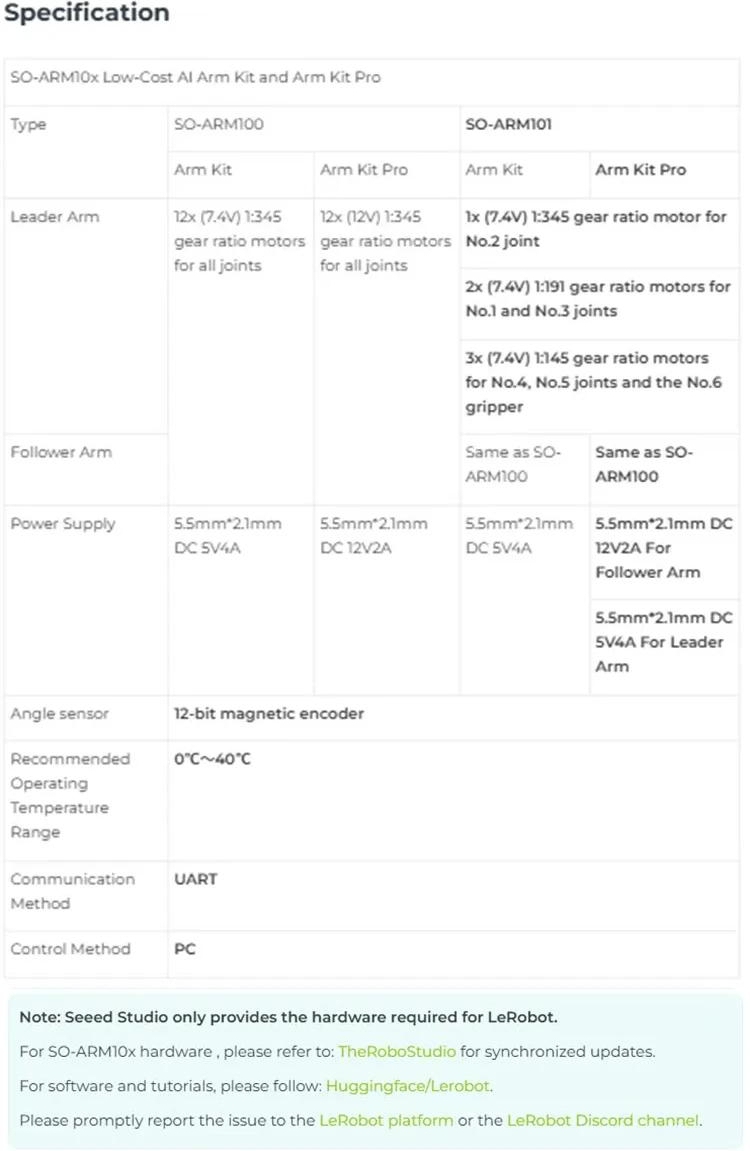 - Standard version (SO-ARM101): Follower robotic arm adopts six ST-3215-C001 servos for Feetech, with parameters of 7.4v, torque of 19kg.cm and transmission ratio of 1:345; advantages: high torque, suitable for gripping and transporting items.