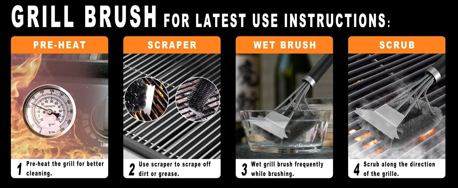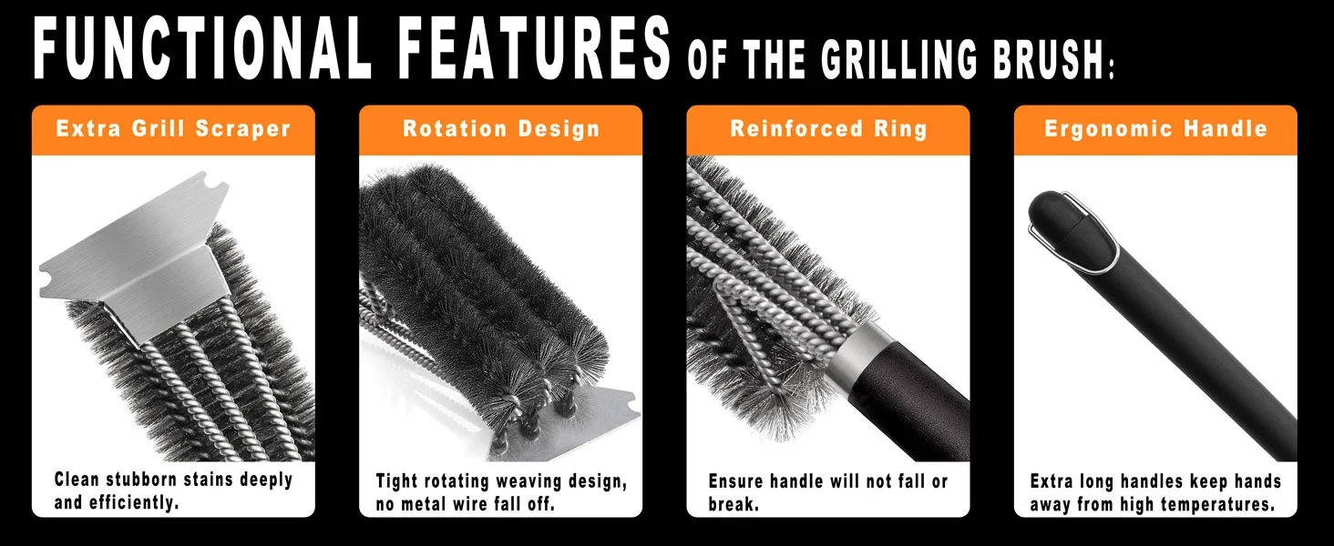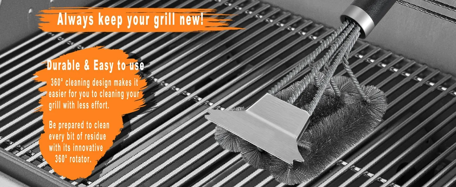 Our grill grate cleaner brush combines with bbq grill scraper, 360° barbecue cleaning brush bristle designed ergonomically with a nice angle and effortless handle developed ever, which just aims for cleaning quickly, deeply and efficiently your grill each and every time you use it. This is absolutely and exactly that a grill masters and barbecue enthusiasts eager for.
