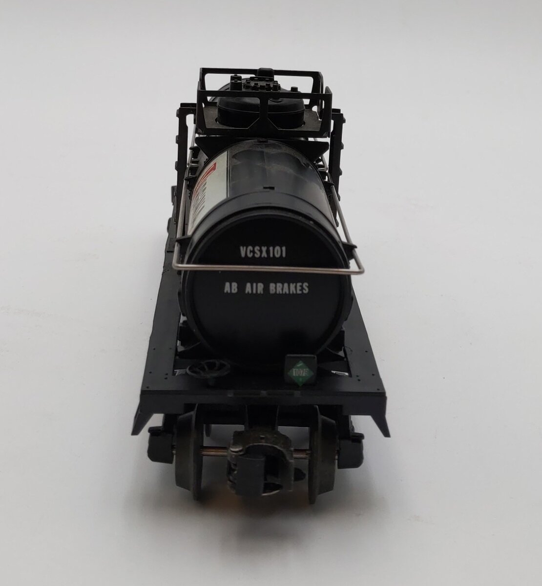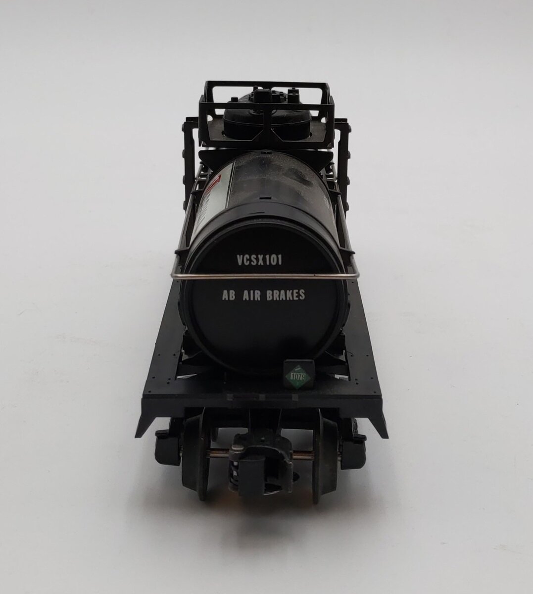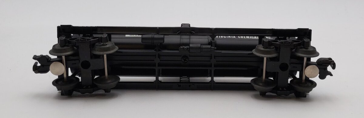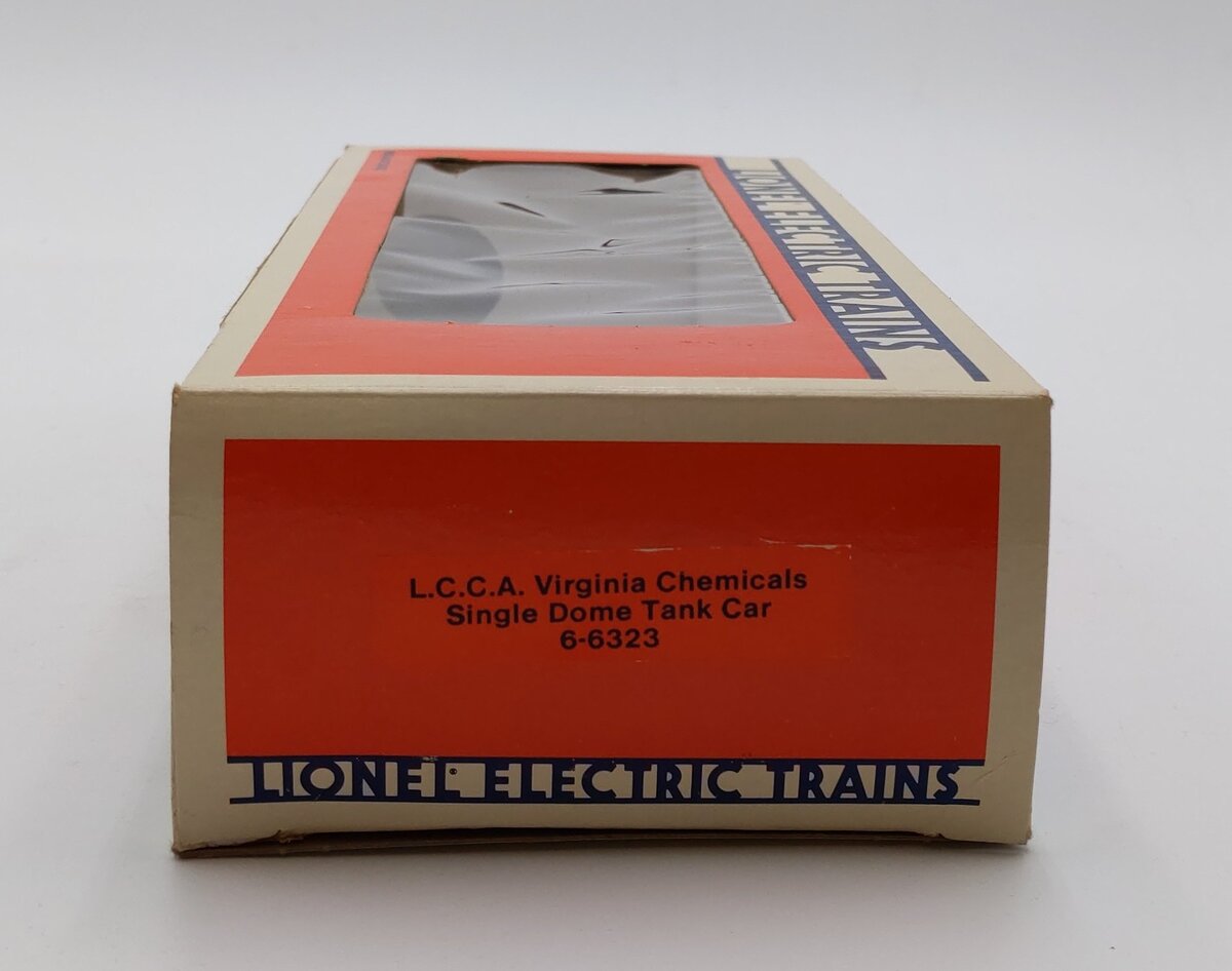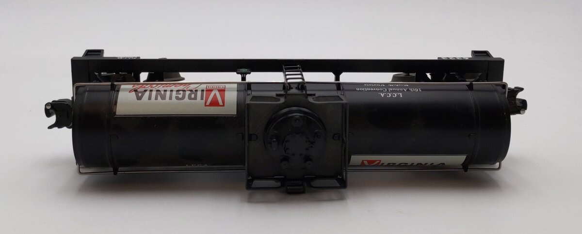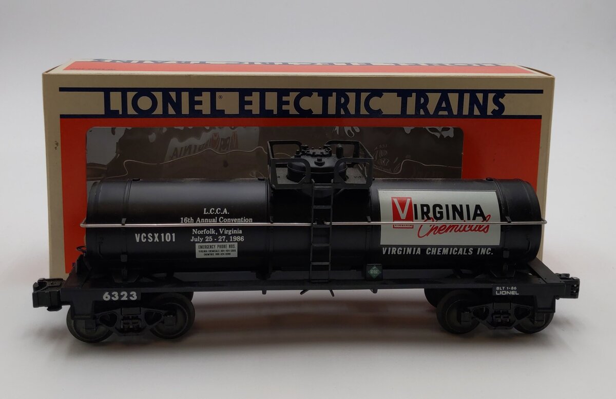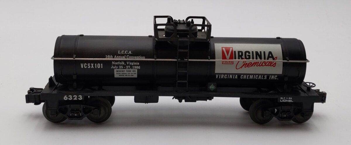 Here is Lionel 6-6323 O Gauge LCCA Virginia Chemicals Single Dome Tank Car from 1986. This car was made especially for the Lionel Collectors Club of America (LCCA)'s annual convention, held that year in Norfolk. This car features die-cast metal sprung trucks, die-cast metal operating knuckle couplers, and metal wheels and axles.