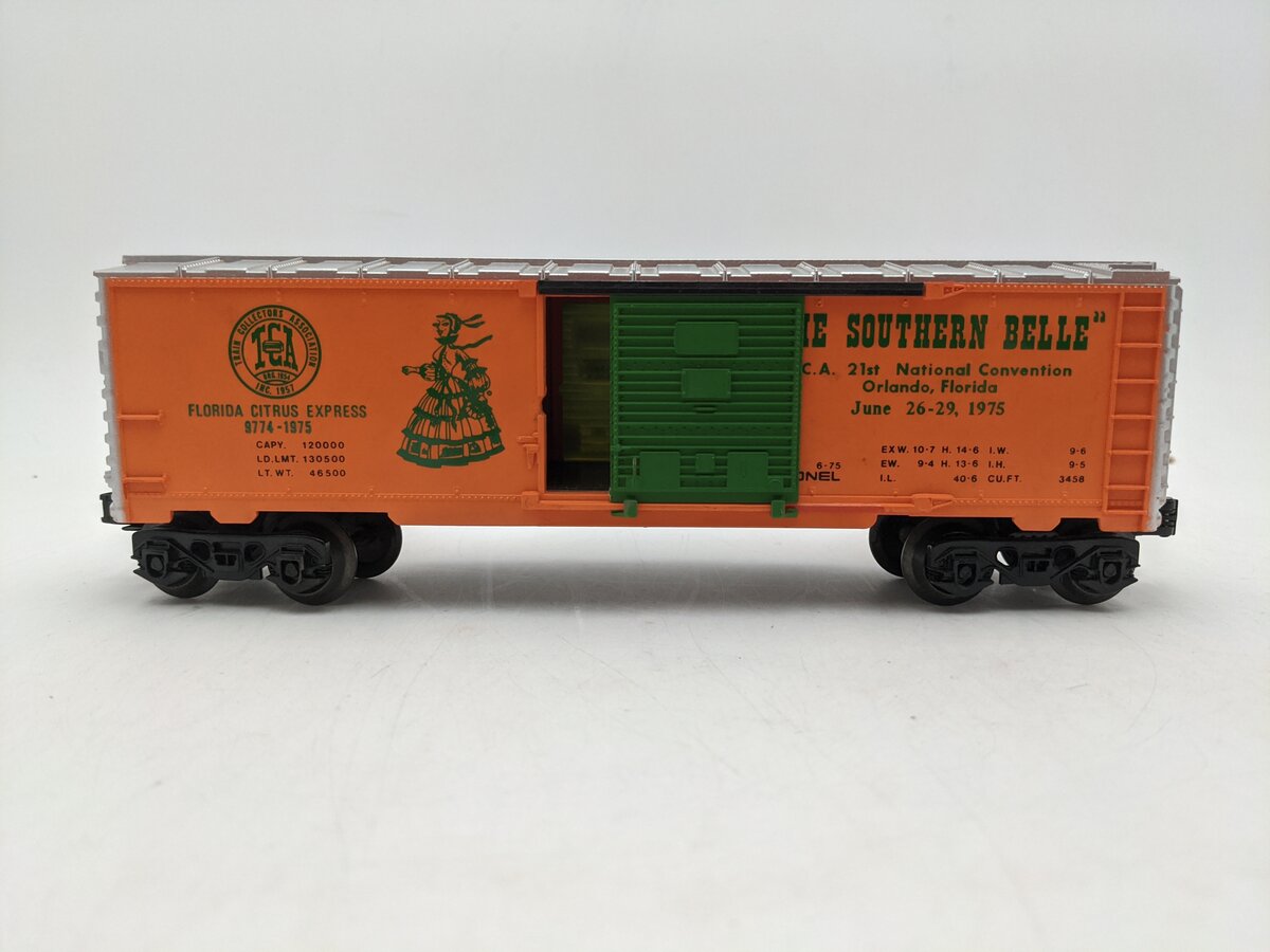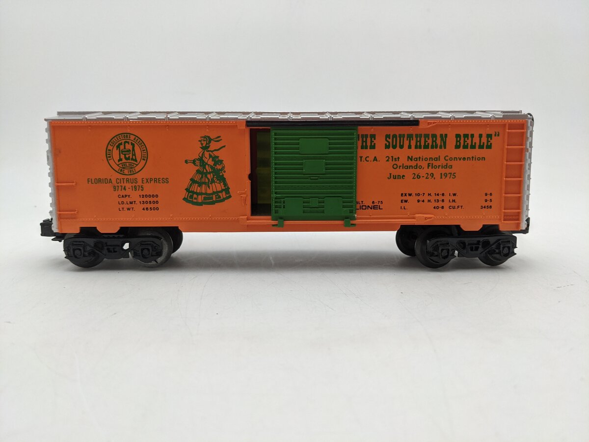 Here is a Lionel 9774 Train Collectors Association (TCA) Southern Belle Boxcar from 1975. This car was made to commemorate the TCA's convention from that year, held in Orlando. This boxcar features sliding doors, plastic trucks, operating knuckle couplers and metal wheels and axles.