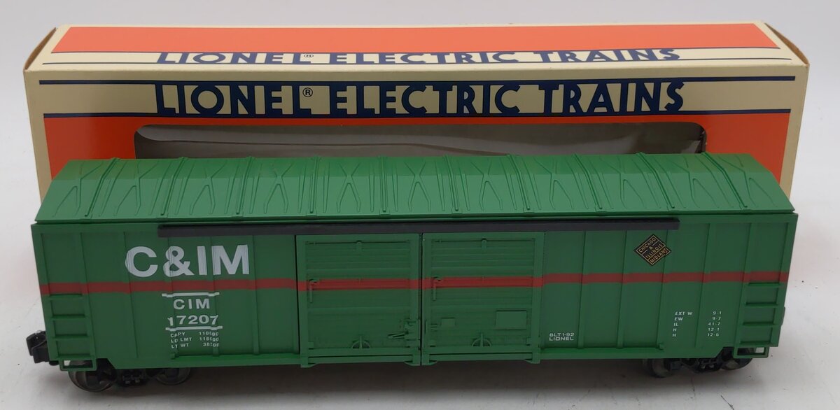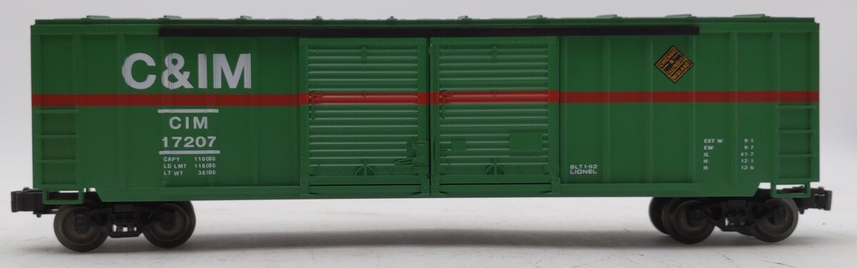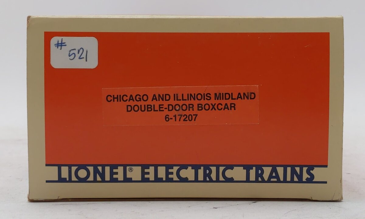 This is a Lionel 6-17207 O Gauge Chicago & Illinois Midland Double Door Boxcar. This car is scale length and features die-cast metal sprung trucks, die-cast metal operating knuckle couplers, and metal wheels and axles.