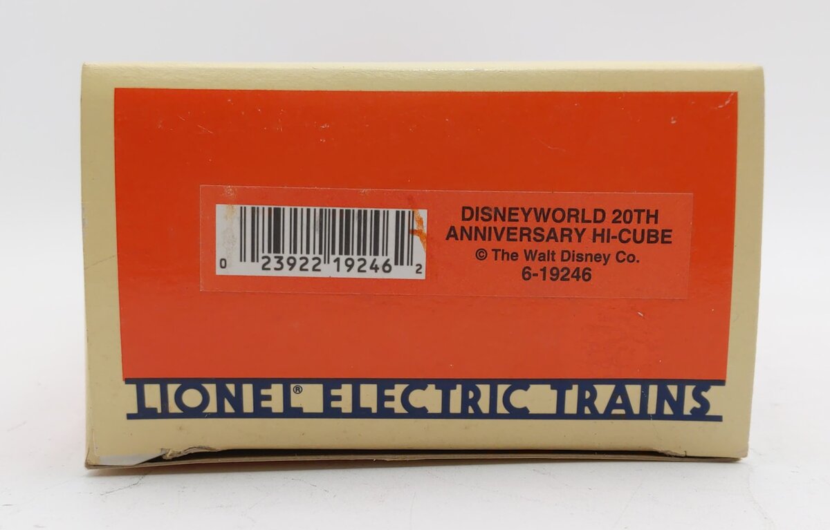 Here is a Lionel 6-19246 O Gauge Walt Disney World 20th Anniversary Hi Cube Boxcar #19246 from 1992. This boxcar features die-cast metal sprung trucks, die-cast metal operating knuckle couplers, and metal wheels and axles.