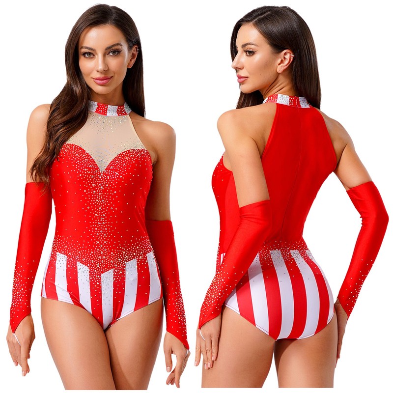 Womens Circus Ringmaster Sparkly Rhinestone Striped Fingerless Gloves Bodysuit