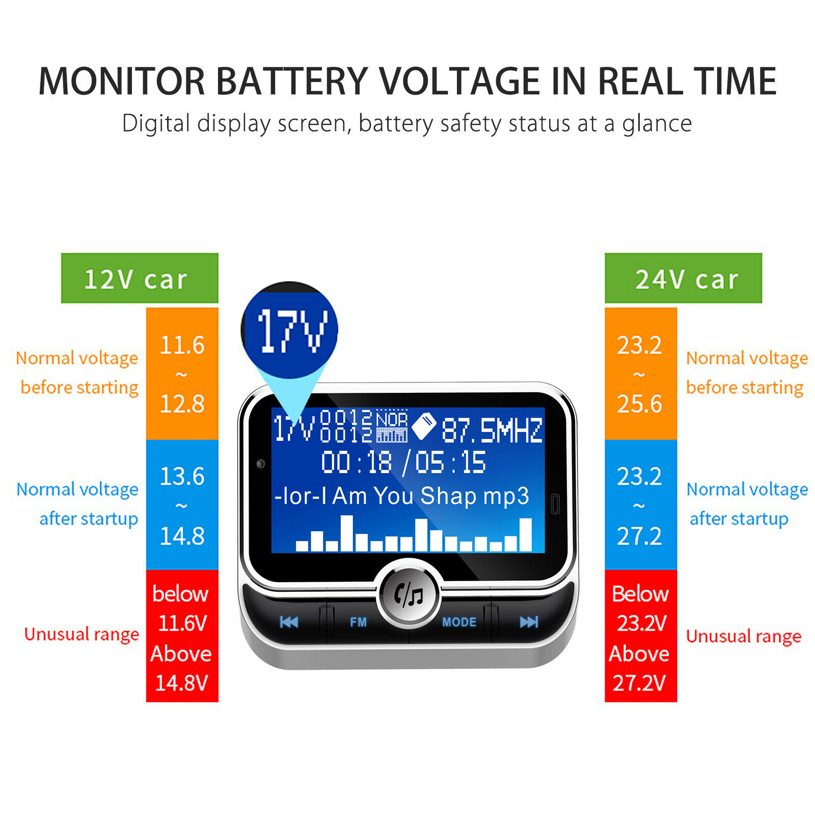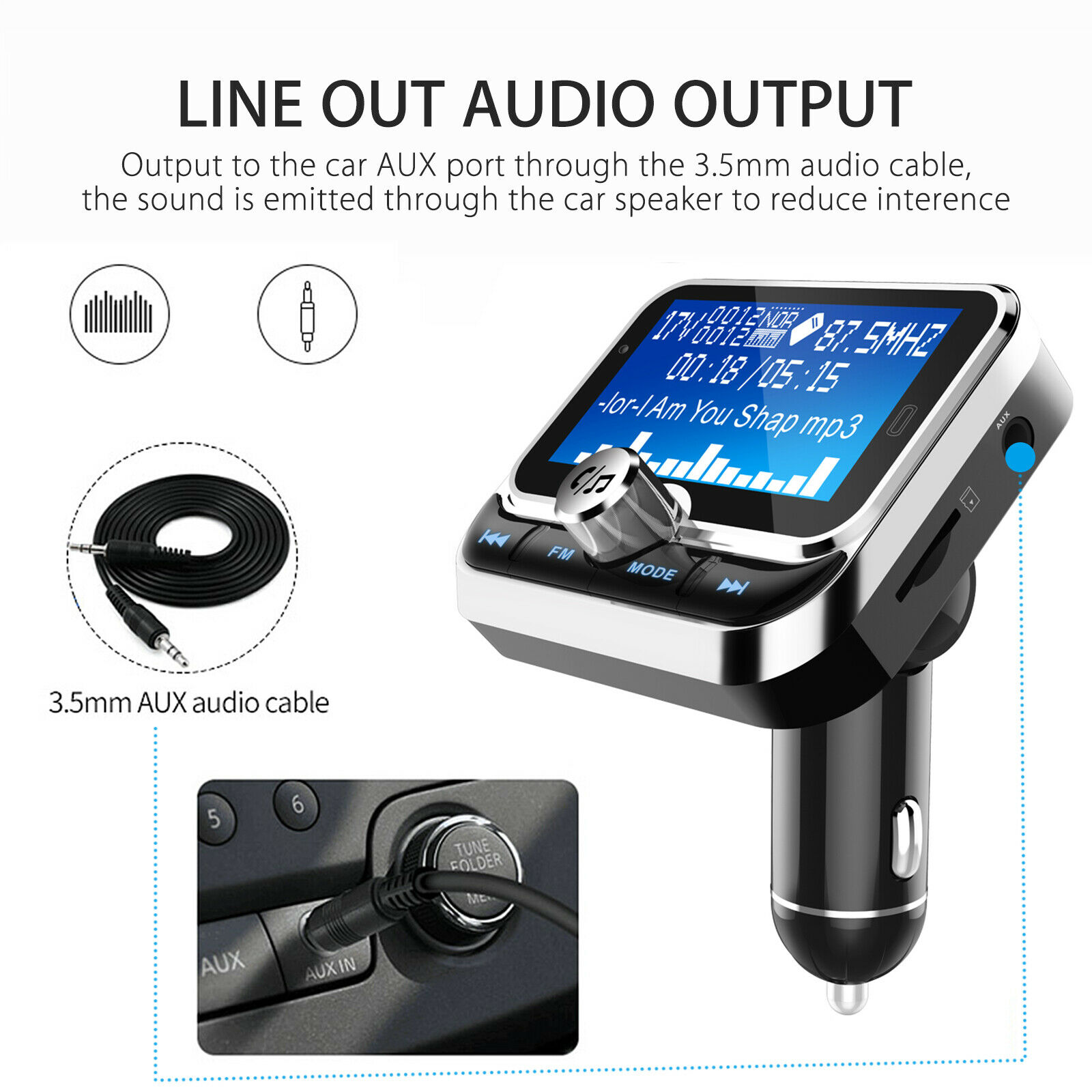 Large Screen and Compact Design -- 1.8-inch large screen displays voltage level in car battery, incoming call number, volume, FM frequency and song name while playing music from Micro SD card or U-disk. Compact design will not block gearshift. Perfect for safe driving.