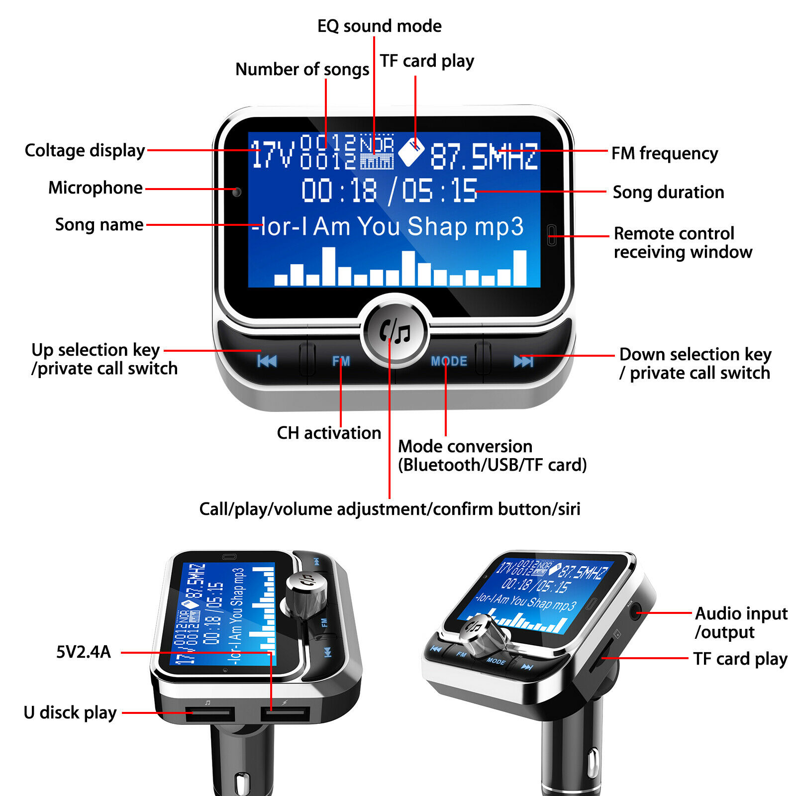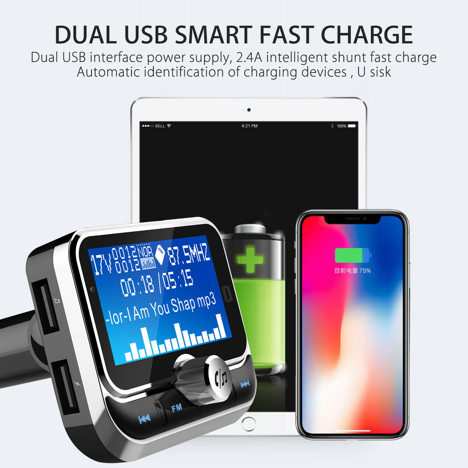 Dual USB Ports and Safe Charging -- One port for U-disk and play music. The other 5V/2.4A USB port is for fast charging. With overcharge protection, you can enjoy in-car stereo music and charge smartphones at the same time.