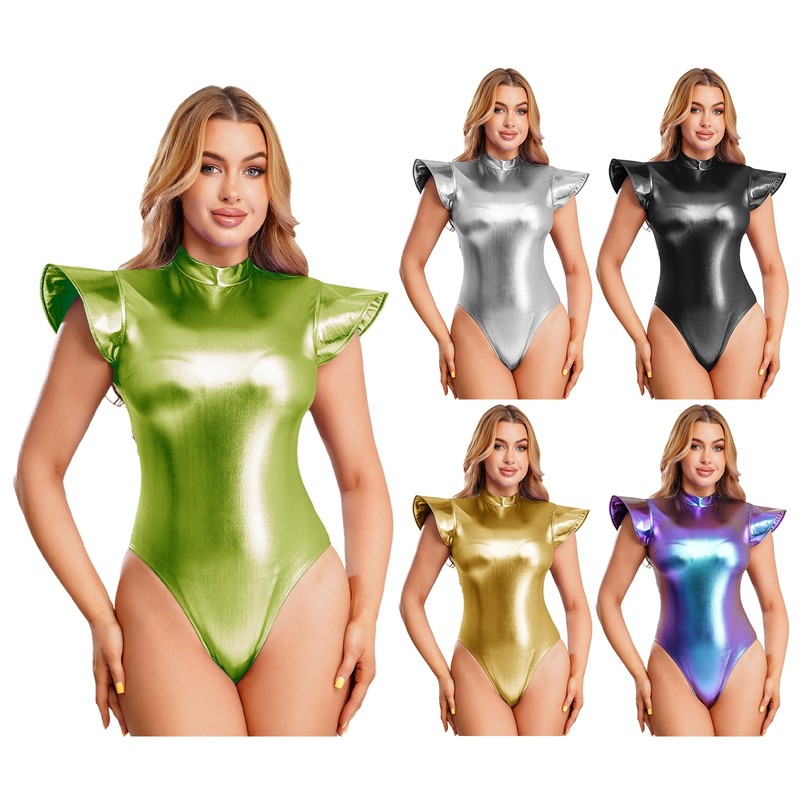 Women Metallic Shiny Sleeveless Gymnastic Ballet Dance Leotard Bodysuit Costume