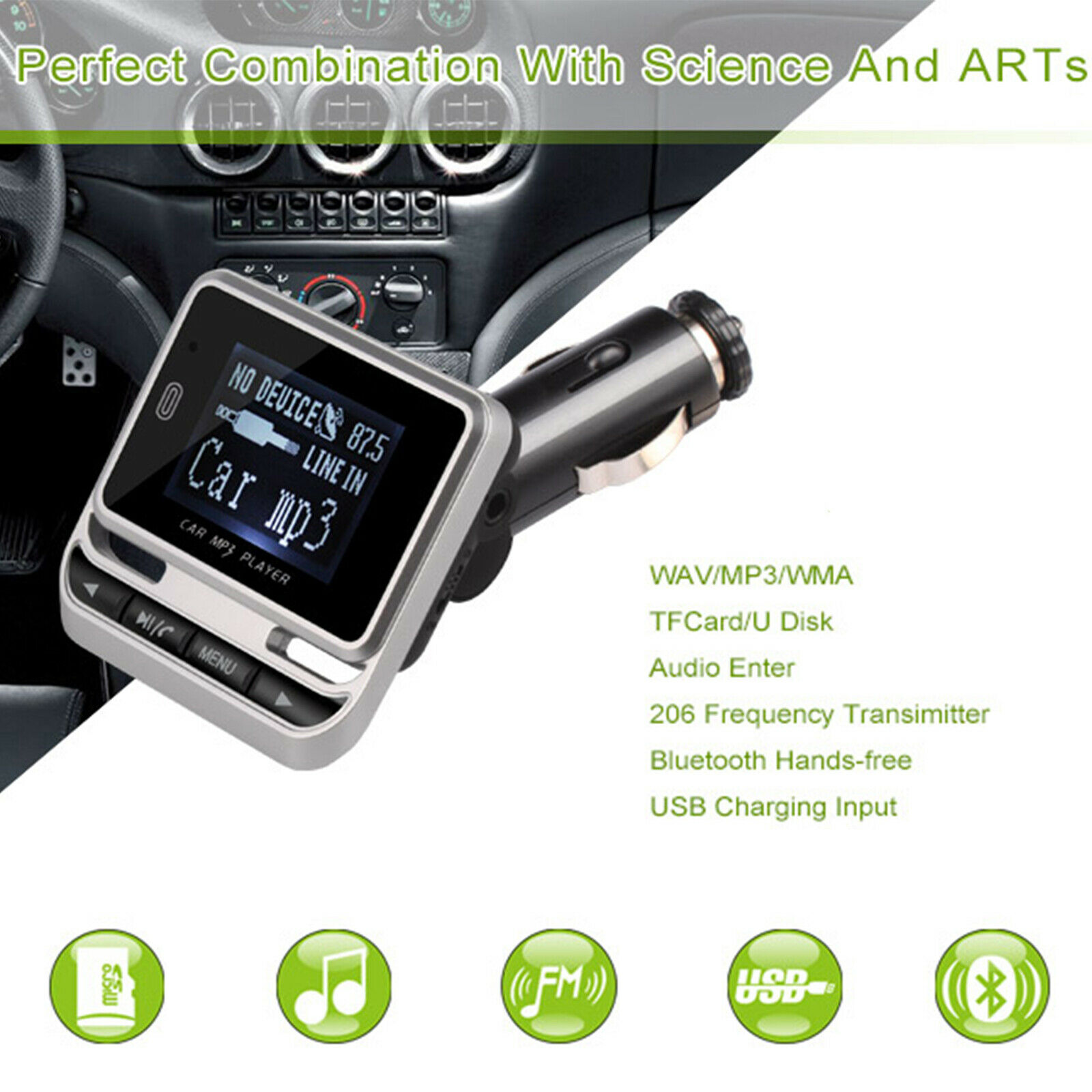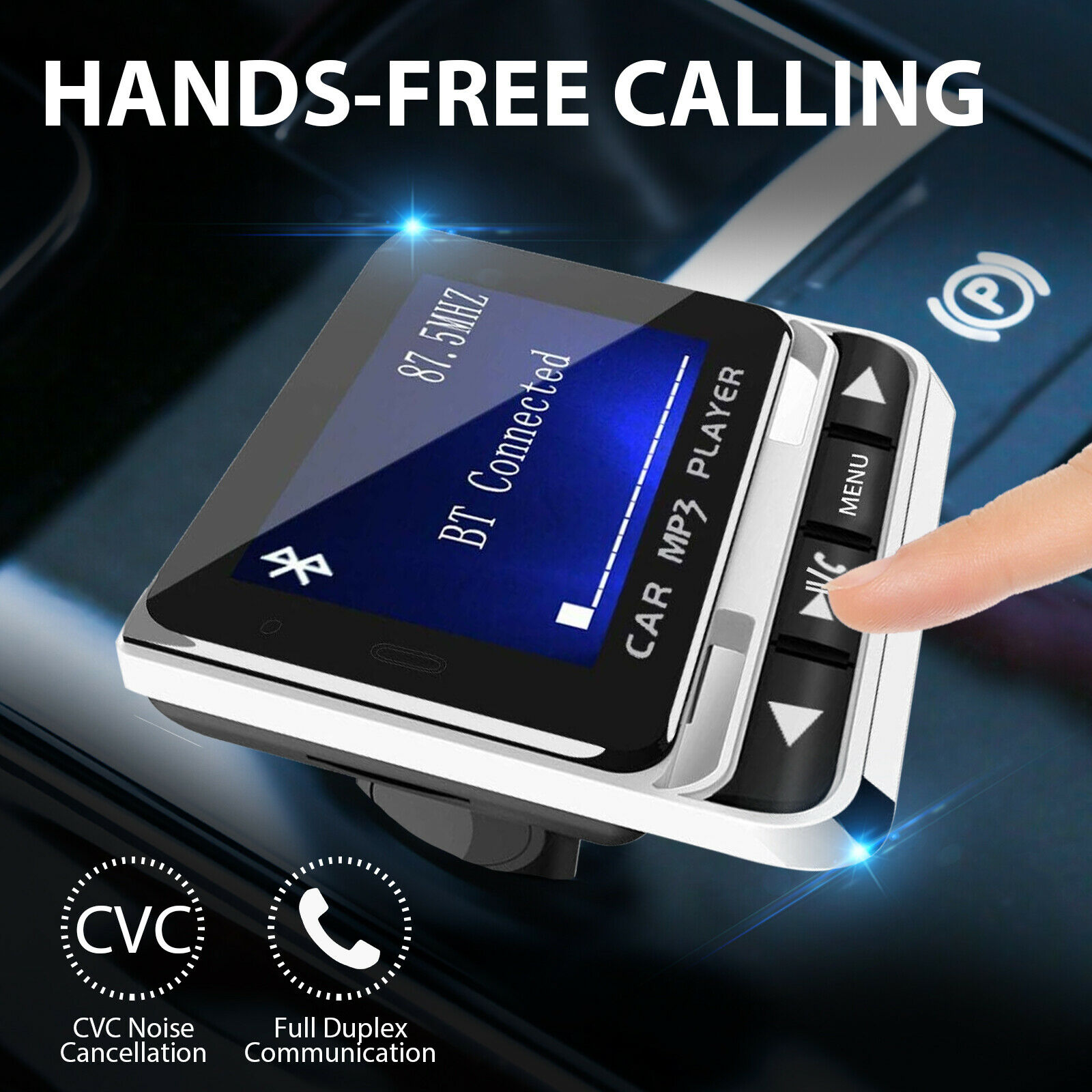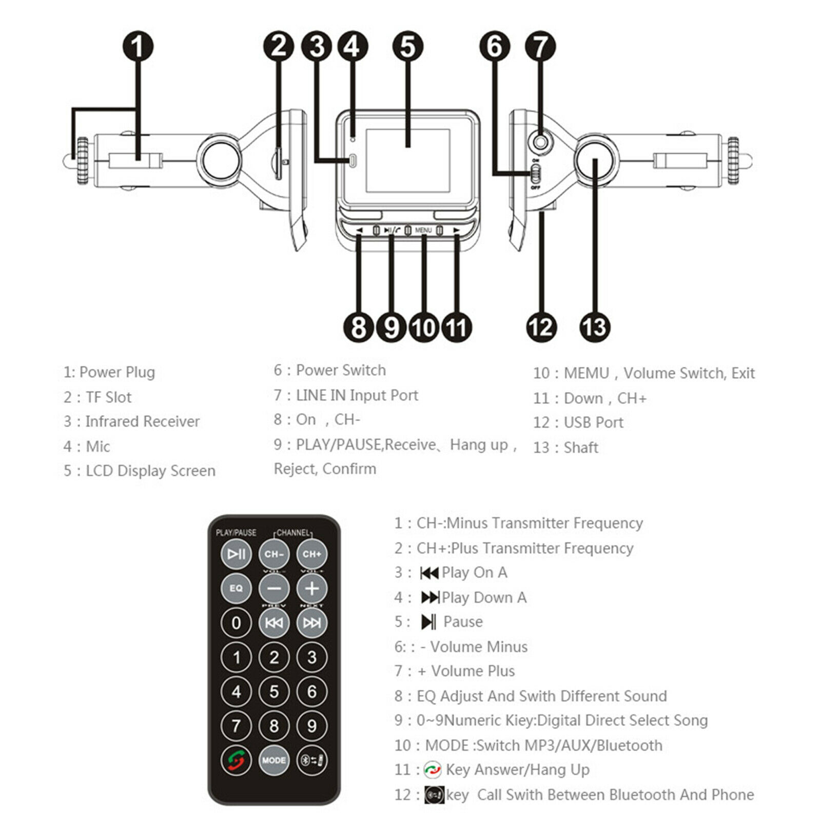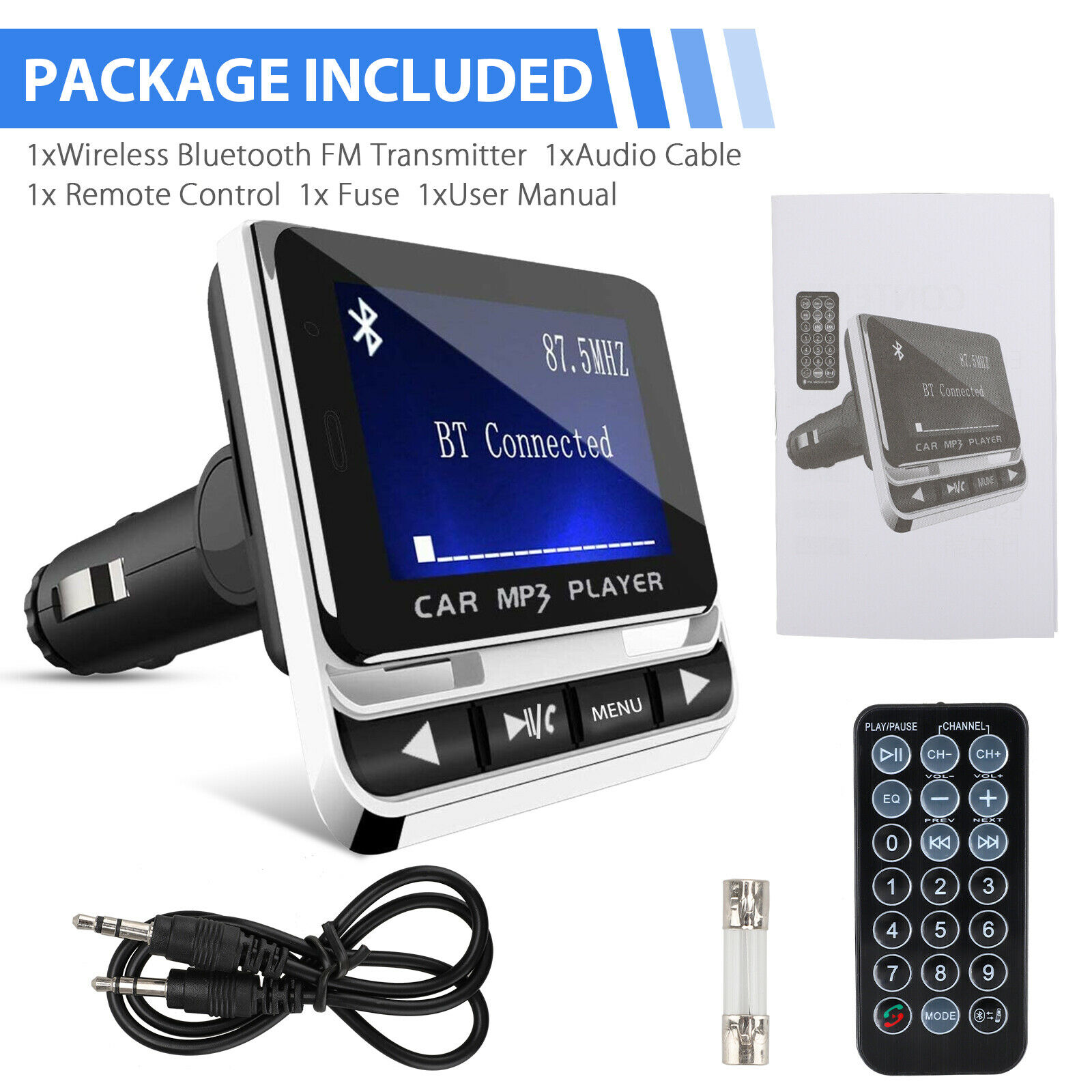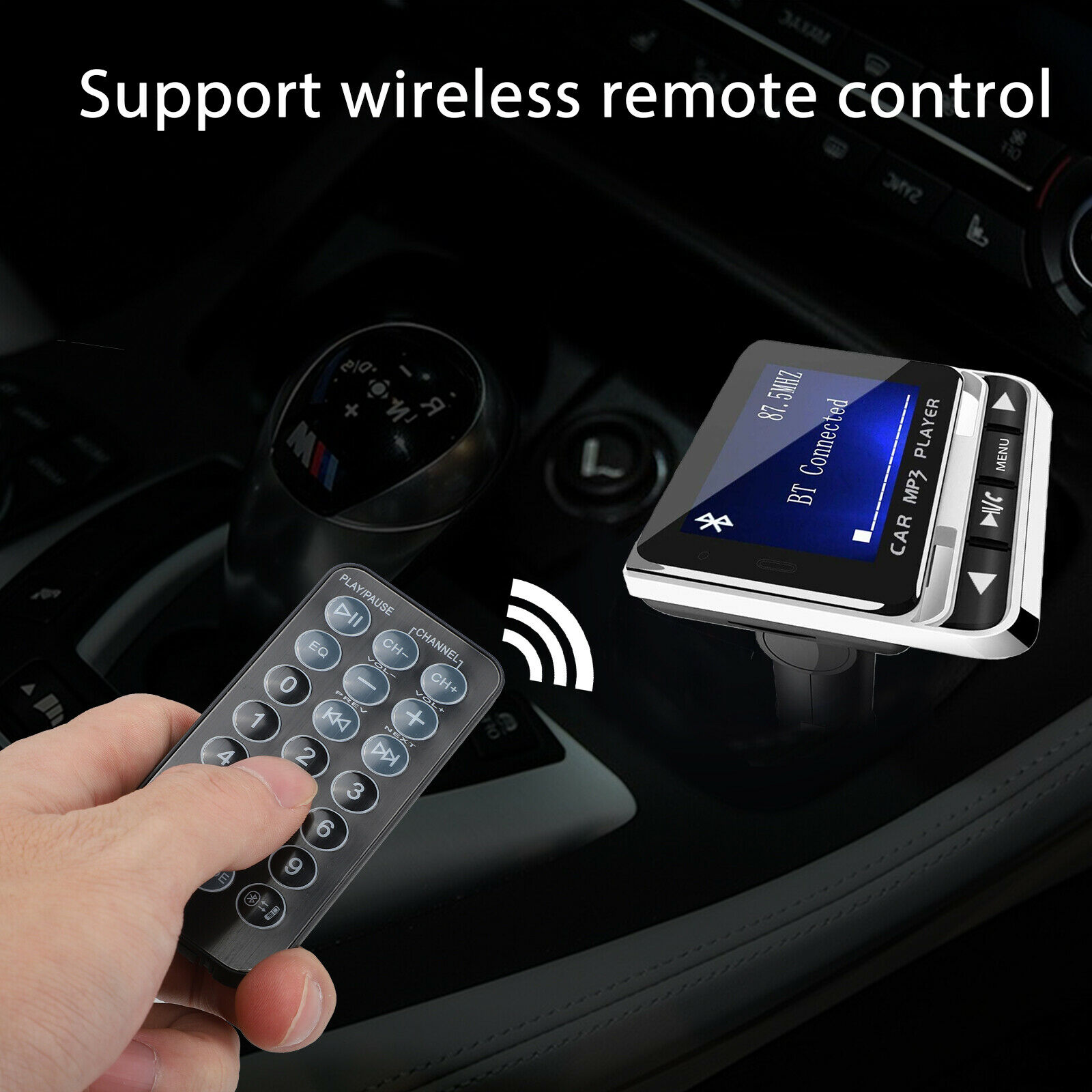 Music Playing: Support with 21-key remote control for the FM Transmitter. The car FM transmitter allows you to play music from your phone to car stereo system via Bluetooth, also support TF card and Aux, MP3/WMA format. Full 206 channels optional from 87.5-108.0MHz.