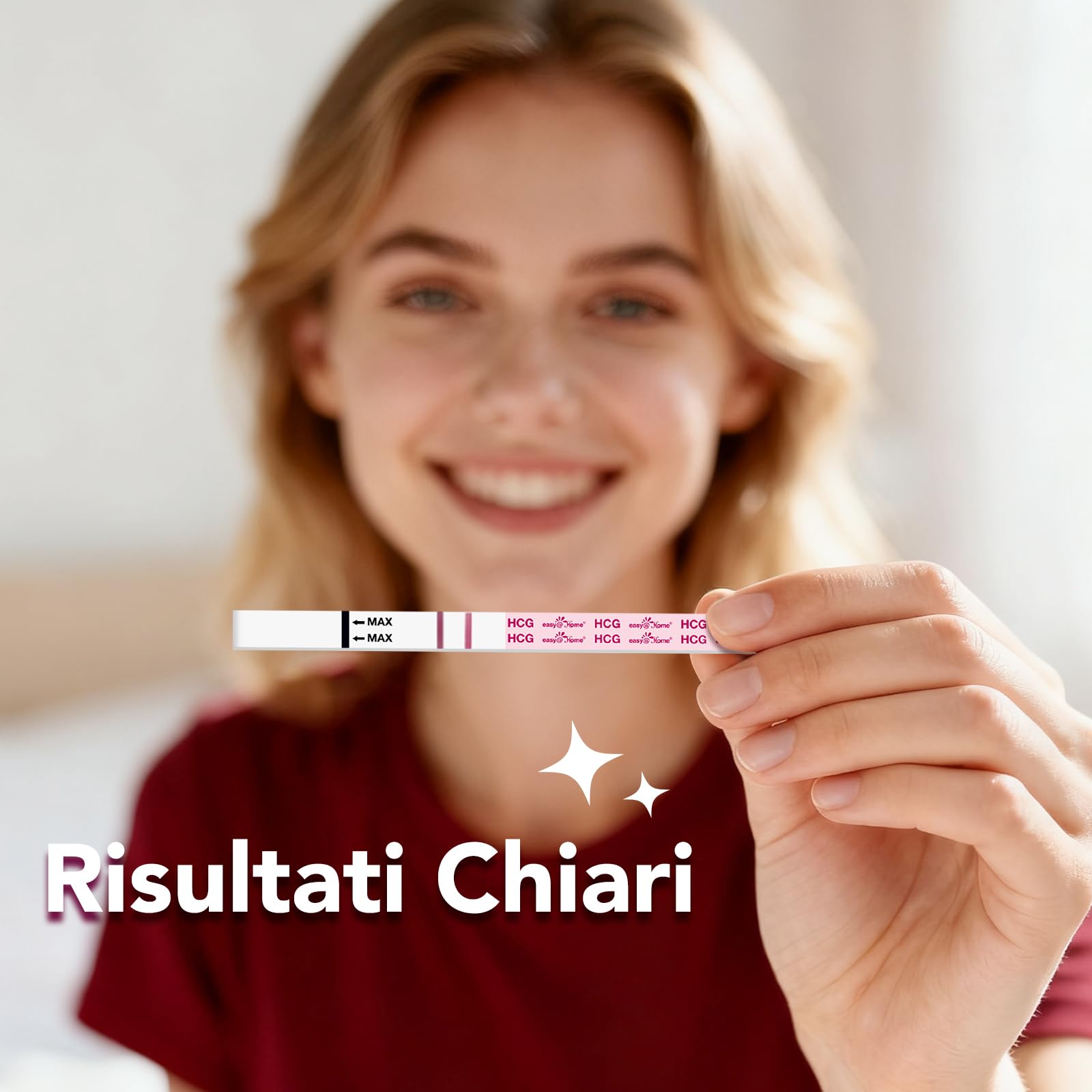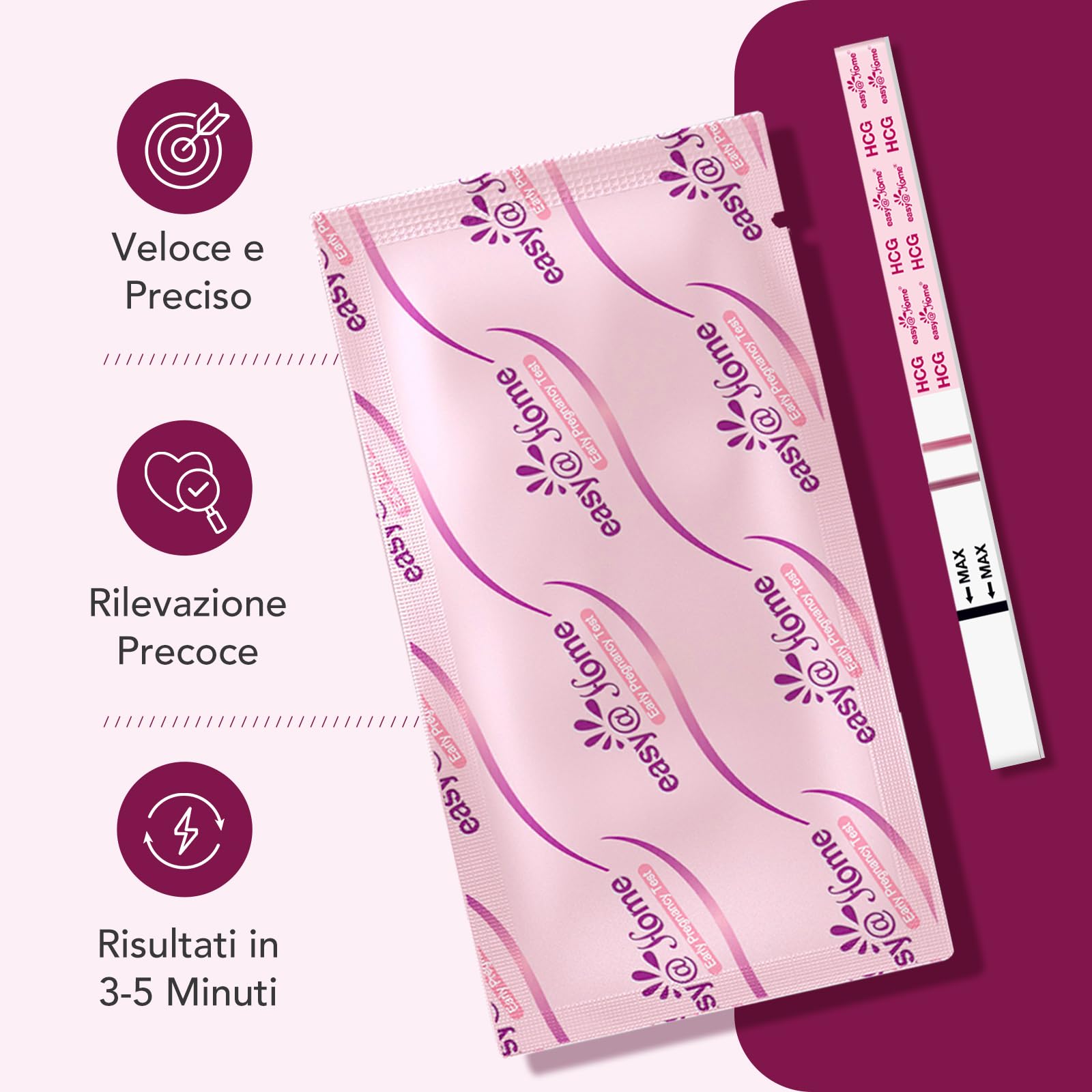 Scopri l'affidabilità dei test di gravidanza Easy@Home, progettati per rilevare precocemente la gravidanza con una sensibilità di 10 mIU/ml di hCG. Questo kit include 20 strisce reattive ultra sensibili che forniscono risultati rapidi e precisi in soli 3-5 minuti. L'utilizzo è semplicissimo: basta immergere la striscia nelle urine per 5 secondi. L'interpretazione dei risultati è chiara e immediata: due righe indicano una gravidanza, mentre una riga indica assenza di gravidanza. Le linee potrebbero apparire più chiare nelle fasi iniziali della gravidanza e diventare progressivamente più scure con l'aumento dei livelli di hCG. Per una gestione ottimale dei risultati, è possibile utilizzare l'app Premom, che permette di salvare e confrontare i risultati dei test nel tempo, eliminando la necessità di conservare le strisce usate.