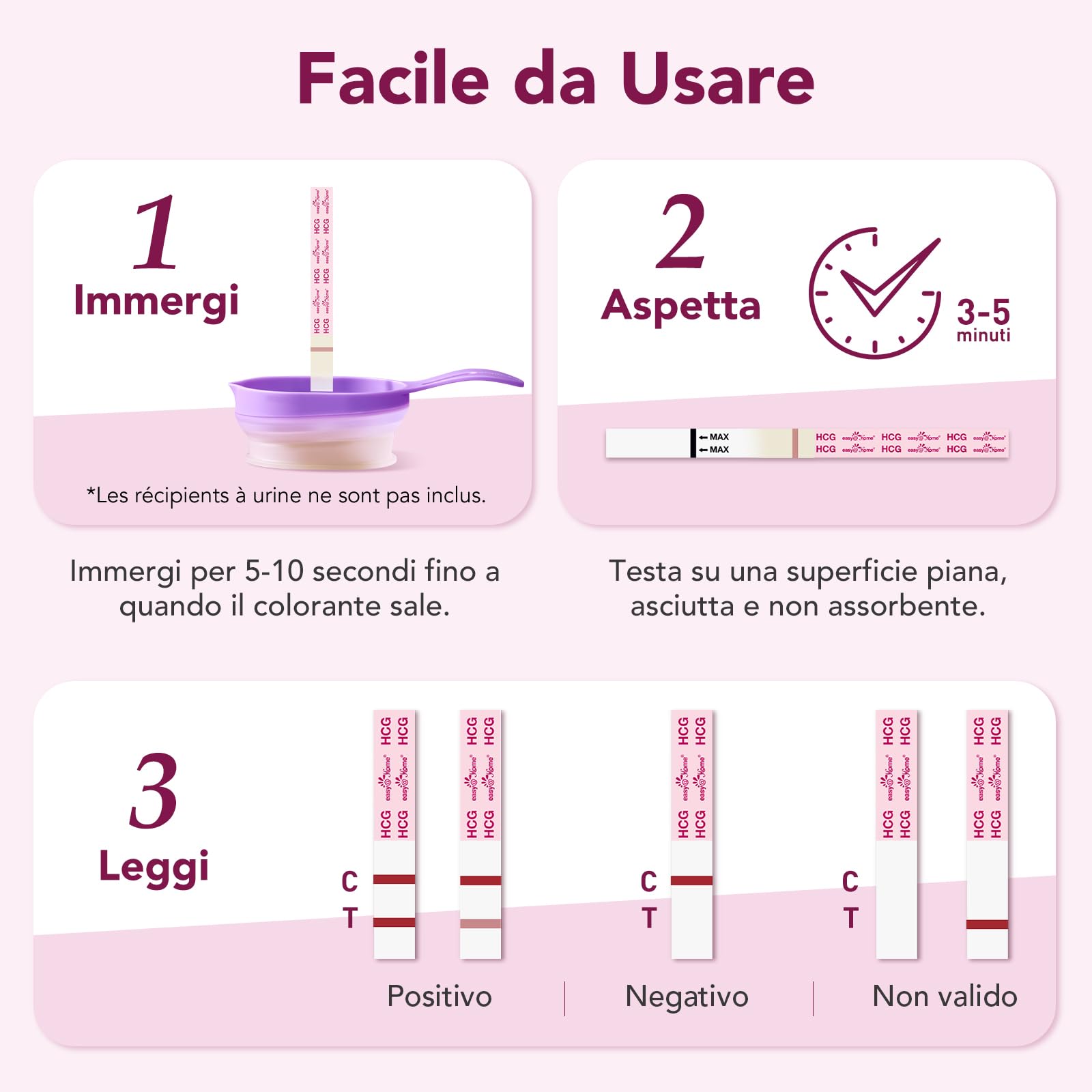NOTA: le linee potrebbero essere più chiare nelle prime fasi della gravidanza, ma diventeranno più scure man mano che i livelli di HCG aumentano. (Questo è normale) Il nostro consiglio: ripeti il test nei prossimi giorni per confermare il risultato - le nostre offerte hanno sempre un numero sufficiente di test.