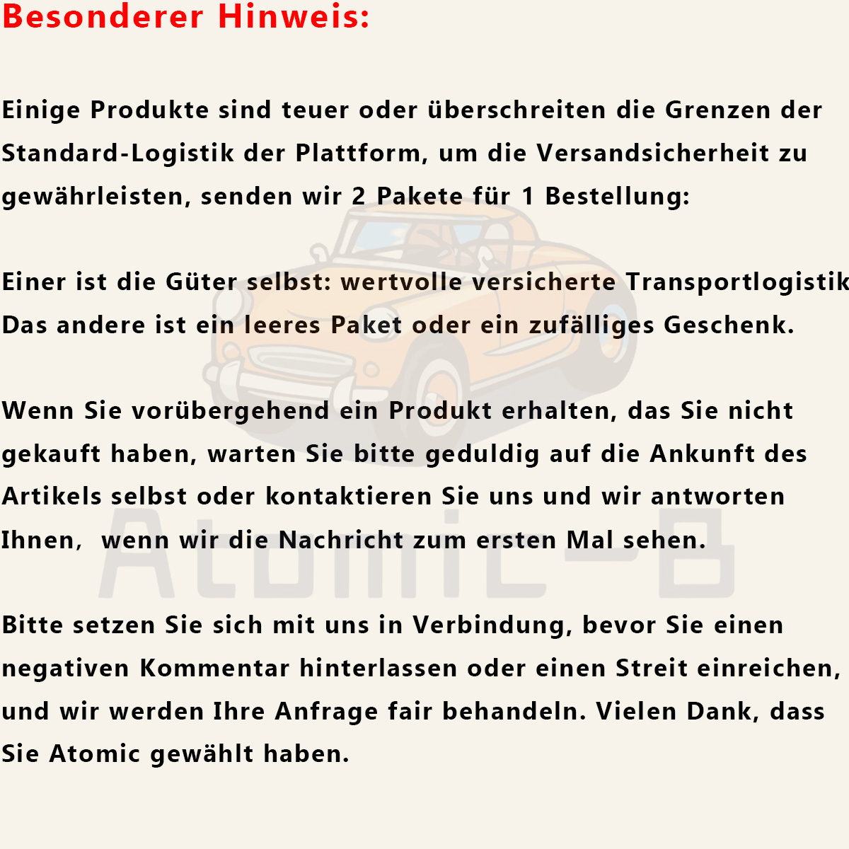3. Rücksendungen: Alle Rücksendungen müssen in der Originalverpackung und in unbenutztem Zustand erfolgen. Alle montierten oder benutzten Teile sind von der Rückerstattung ausgeschlossen. Bei Problemen kontaktieren Sie uns bitte vor der Rücksendung eines Artikels.
