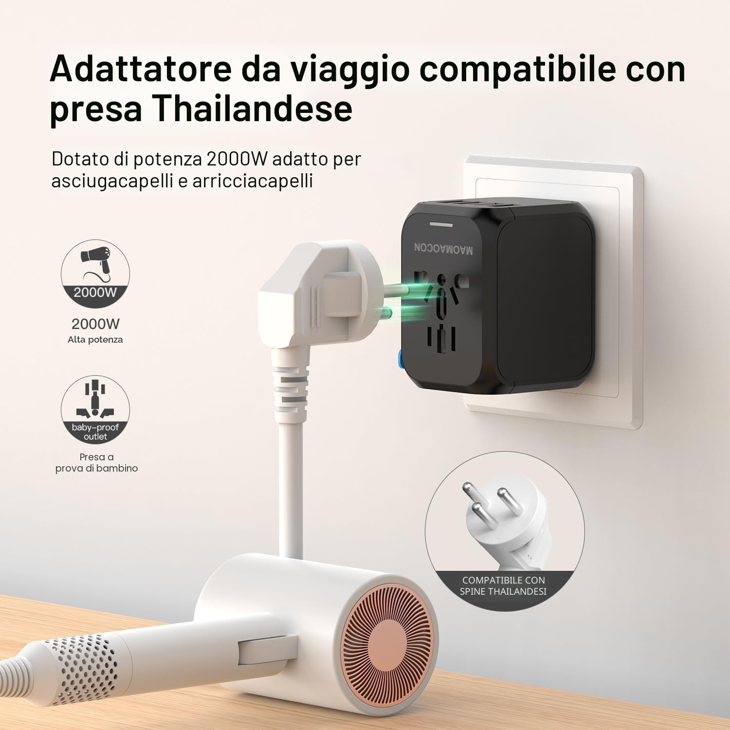 Sicuro e affidabile: l'adattatore da viaggio è dotato di un fusibile 6A a ripristino automatico per proteggere efficacemente i tuoi dispositivi da danni e supporta una potenza fino a 1500W.