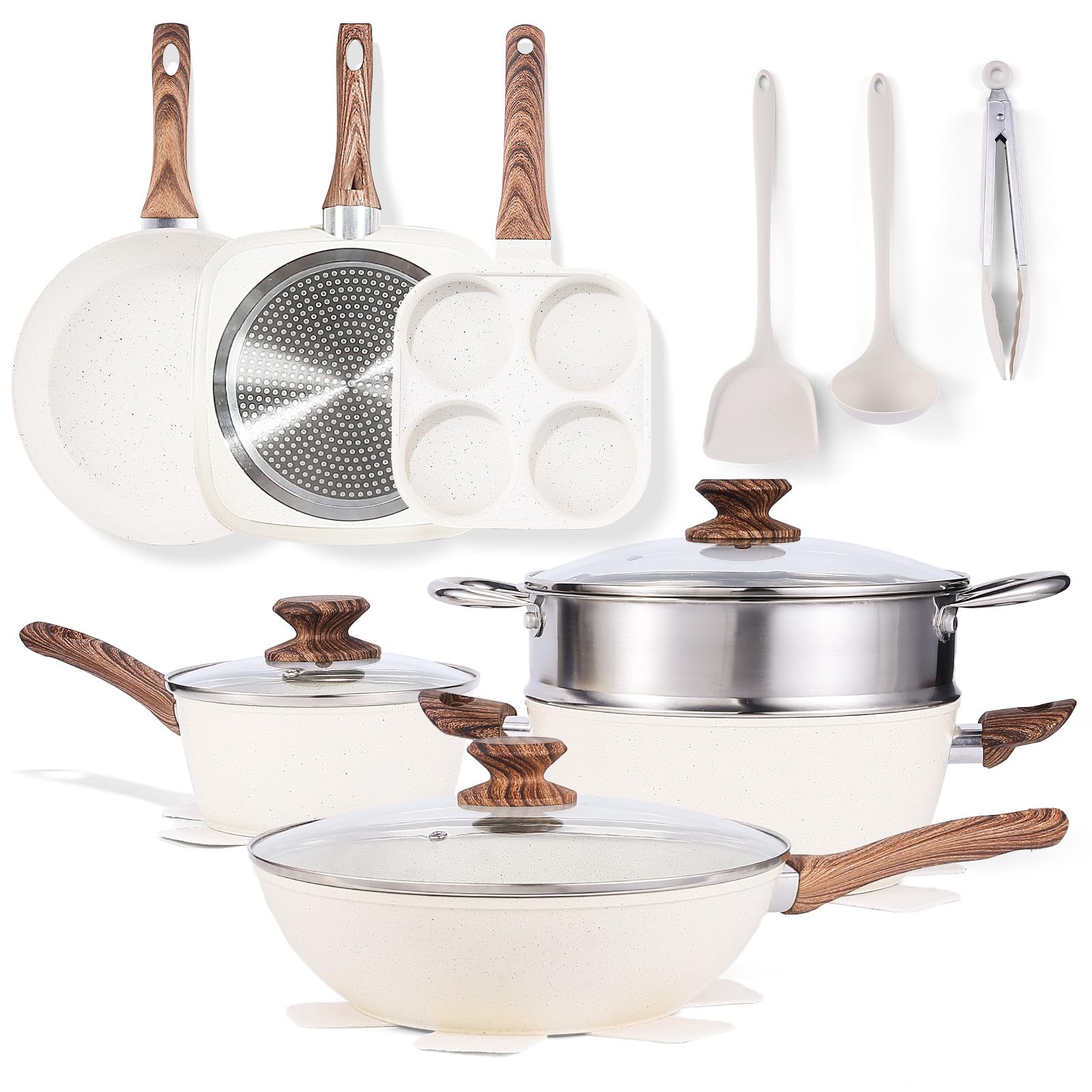【Complete 17-Piece Cookware Set】Includes: 111" frying pot with glass lid, 9.5" souppot with glass lid, 6.3" milkpot with glass lid, 11" frying pan, 11" square pan, 7.5" egg pan, 9.5" steamer, 4 pan protectors(8.7"/9.5"/10.3"/11" ), 1 silicon ladle, 1 cooking tongs, 1 silicon spatula.