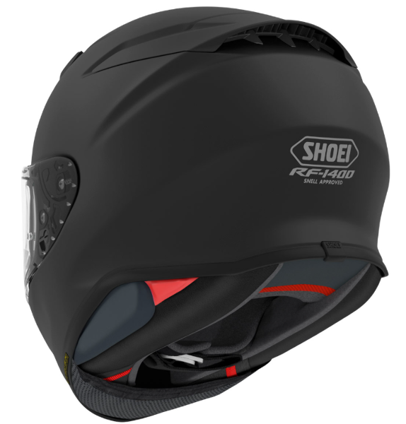 Proprietary technology integrates a matrix of hand-laid interwoven layers of fiberglass and light-weight organic fibers to deliver a helmet that not only meets SNELL and DOT ratings, but is Shoei's strongest, most elastic shell providing the wearer with optimal impact absorption. Adding to that, the RF-1400 is lined with a dual layer of multi-density EPS foam liner that also aids in impact absorption and allows cool air to flow unrestricted through the channels created in the liner. The precise placement of the EPS material helped shape the RF-1400's compact, lightweight design.
