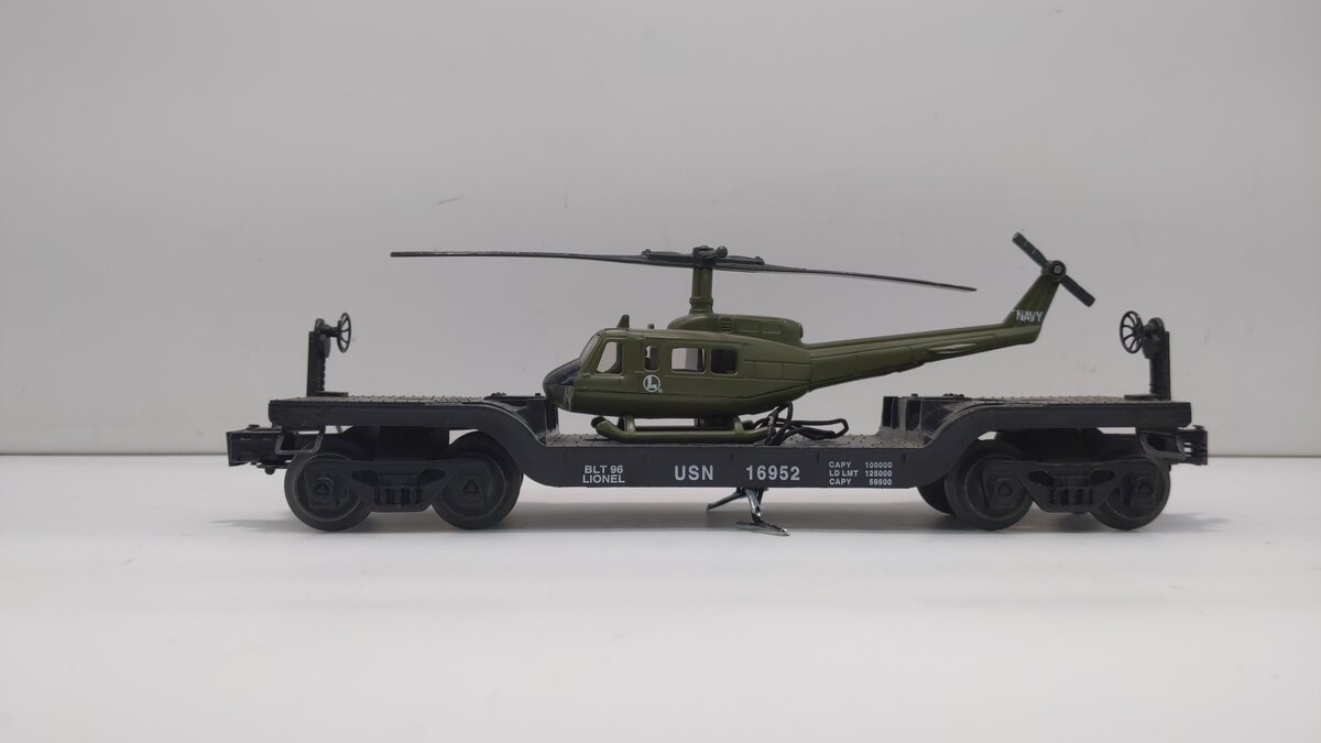 Here is a Lionel 6-16952 O Gauge US Navy Flatcar with Ertl Helicopter #16952 from 1996.