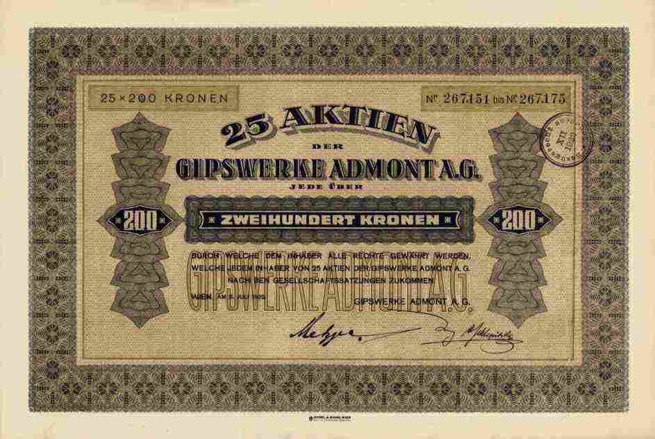 Originalaktie -- siehe Archivbild -- der Gipswerke Admont AG, Aktie über 5.000 Kronen (25 x 200 Kronen), Wien vom 3. Juli 1922. Papier, Mittelfalte, Doppelblattbogen, in guter Erhaltung: VF+. Sammlerfreundlicher Startpreis !