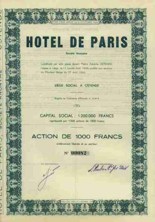 DEKO - Hotel - Aktie !!! Originalaktie -- siehe Archivbild -- der Hotel de Paris über 1000 Francs, Ostende, Belgien (Westflandern) vom 11. April 1946. Gründung der Hotelgesellschaft zum 11. April 1946 mit einem Kapital von 1,2 Millionen Francs. Gewinnanteilscheine Nr. 1 bisw 28 + Talon anhängend. Sammlerfreundlicher Sonderpreis !