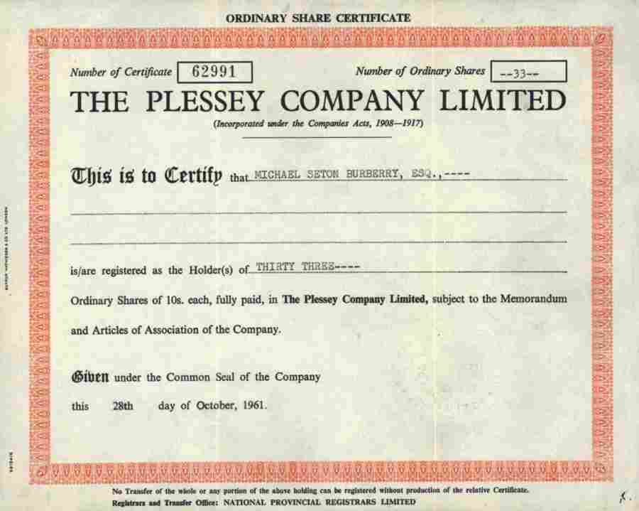 Englischer AKTIEN - KLASSIKLER !! Originalaktie -- siehe Archivbild -- über vers. Shares aus dem Jahr 1961 der THE PLESSEY COMPANY, PLC - Vicarage Lane, Ilford, Essex - United Kingdom. Herstellung von kleinen elektronischen Bauteilen für die Telekommunikation, Luftfahrt und Rüstung. Bereits 1917 gegründet. 1989 von GEC (General Electric) und Siemens übernommen. Sammlerfreundlicher Sonderpreis !