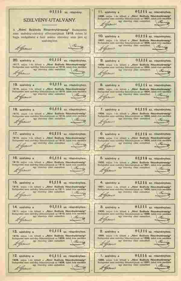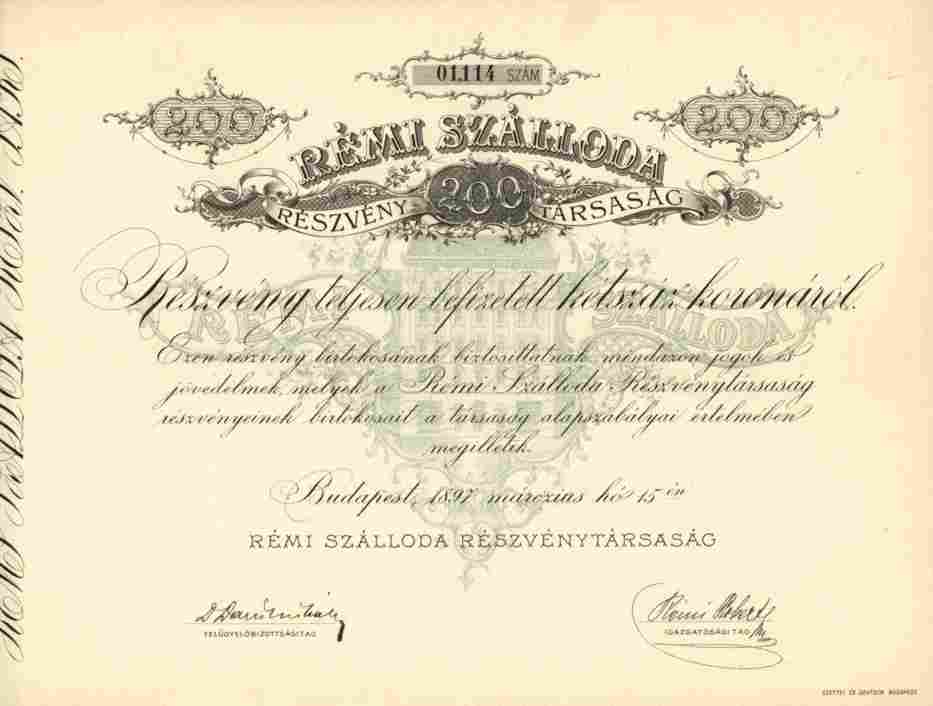 Kaum angebotene -- Hotel - Aktie !! Orginalaktie -- siehe Archivbild -- zu 200 Aktien je 700 Kronen der REMI Hotel Gesellschaft Budapest vom 15. März 1897. Gründeraktie. Bereits 1897 gegründet. Das Hotel Rémi (heute Hotel Nemzeti) war für seine Zeit sehr modern: In diesem Gebäude in Ungarn funktionierte der erste Aufzug, und alle Zimmer waren mit Strom, Warm- und Kaltwasser ausgestattet. Das Hotel wurde nach dem Gründer Róbert Rémi benannt und Anfang des 20Jahrhundert war es ein Treffpunkt für Künstler dieser Zeit. Das Hotel wurde 1929 verkauft und aufgrund des nahe gelegenen Nationaltheaters in „Nemzeti“ (national) umbenannt. Die wichtigsten Gäste dieser Zeit waren Königin Victoria von Schweden, der belgische Prinz Caraman-Chimay mit seiner Gemahlin Clara Ward. Das Hotel wurde 2012 zusammen mit der Gründung einer kulturell-künstlerischen Gruppe, dem National Artistic Club, renoviert. Orginalunterschrift des Gründers Róbert Rémi !!! Dekorativer Druck mit Abb. des Hotels im Unterdruck. Kompletter Talon mit Kupons Nr. 1 bis 20 + ENS unentwertet anbei !!! Sammlerfreundlicher Sonderpreis !