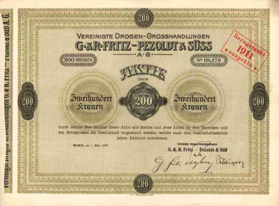 Rare Chemie Aktie ###### Orginal - Gründeraktie -- siehe Bild -- zu 200 Kronen der Vereinigte Drogen Grosshandlungen G & R Fritz - Pezoldt & Süss AG, Wien vom 1. März 1907. Großformatiger Druck von Waldheim Eberle AG : Übergröße: 265 x 360 mm. Sonderversand ungeknickt im stabilen Hartkarton als Einschreiben nur 6,- Euro (Inland). Weltweit : 8,00 Euro. Großhandel mit pharmazeutischen und chemischen Produkten. Wahrscheinlich überlebte die Ges. die Inflationszeit nicht. Ab 1924 wurden keine Kupons mehr eingelöst. Kupons Nr. 18 + 19 + Talon anbei. BESONDERHEIT: Nur dieser Jahrgang trägt die FS Unterschrift des Firmenmitgründers G. Fritz !! Papier, Doppelblatt in guter Erhaltung: VF+. Sammlerfreundlicher Sonderpreis !