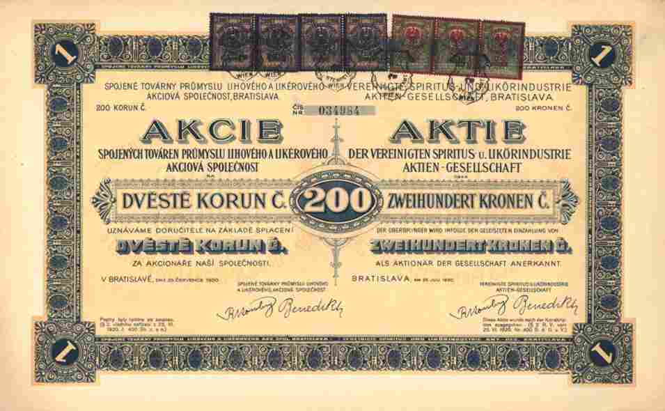 Dekorative Likör - Aktie ## Orginalaktie -- siehe Archivbild -- zu 200 Kronen der Vereinigte Spiritus- und Likörindustrie AG in Bratislava (Pressburg) Slowakei vom 25. Juli 1920. Gründeraktie. Grossformat: ca. 410 x 255 mm: Sonderversand ungeknickt im stabilen Hartkarton nur 4,- €. Welteit: 6,- €. Gründung im Dezember 1919. Die Gesellschaft besaß die Melassespiritus- und Pottaschefabrik vorm. S. Adler & Söhne in Schönau bei Neutitschein, die Likör- und Edelbranntwein-Destillationswerke Mähr.-Ostrau, die Likörfabrik vorm. S. Adler & Söhne in Neu-Titschein sowie sämtliche Aktien der M. Ripper’s Söhne AG Likör-, Rum- und Kognakfabrik, Borovicka- und Slivovitz-Brennerei und Weingroßhandlung in Zilina, ferner die A. Delpey & Co. AG, Fabrik für Edel-Liköre und Weinbrand in Berlin. Dekorativer Druck zweisrachig (Deutsch/Tschechisch) mit einigen Steuermarken oben mittig und Zierrand. Gewinnanteilscheinbogen mit Kupons Nr. 3 bis 20 + ENS anhängend. Sammlerfreundlicher Sonderpreis !