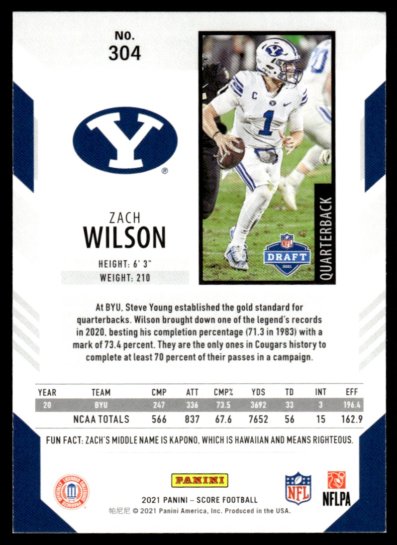 | 2021 Score Zach Wilson Rookie BYU Cougars #304 |