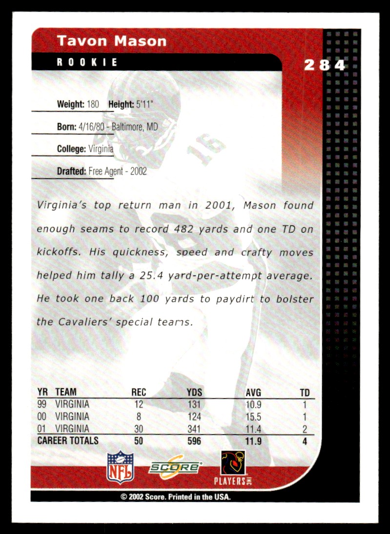 | 2002 Score Tavon Mason Rookie Virginia Cavaliers #284 |