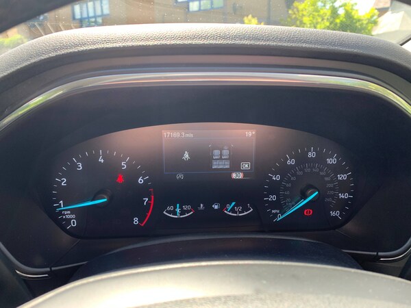 3x3 point rear seatbelts, ABS+Electronic Brake force Distribution, Auto hold function, Driver airbag, EDL traction control, Electronic parking brake, Electronic stability control, Front and rear seatbelt reminder, Front inertia reel height adjustable seatbelts with pre-tensioners, Front passenger airbag, Front side airbags, Passenger airbag deactivate switch, Post collision braking, Pre collision assist with autonomous emergency braking and pedestrian/cyclist detection, Remote/power child rear door locks, Side curtain airbags, Three rear inertia reel lap/diagonal seatbelts, Tyre pressure monitoring system, 4.2” Colour TFT Ice blue illumination analogue cluster with trip computer, Bluetooth system, Cruise control including adjustable speed limiter, Digital clock, Easy fuel capless refuelling system, Eco mode, Ford SYNC 4 Navigation with 13.2 inch touchscreen, DAB radio, Emergency Assistance, Apple Carplay and Android Auto, 6 speakers and FordPass Connect, Front and rear parking sensors, Lane keeping system - lane keeping alert and lane keeping aid, PAS, Rev counter, Selectable drive mode, Service interval indicator, Auto headlamps (on/off), Body coloured door handles, Electrically operated front and rear windows with one touch opening and closing, Electrically operated heated power fold door mirrors with puddle lamp with side indicators, Front variable intermittent wipers with electric wash, Full fixed LED headlamps, Grille with chrome surround and horizontal bars, Heated rear window, LED daytime running lamp, LED rear lamps, LED third brake light, Quickclear heated windscreen, Rain sensor, Rear side wing doors, Solid paint, Tailgate wash/wipe, 3 rear headrests, 3 seat bench in 2nd row, Cloth upholstery, Dual zone electronic air temperature control, Height adjustable front headrests, Isofix child seat preparation, Manual 2-way passenger seat adjust, Manual 4-way driver seat adjust, with manual lumbar adjust, Reach + rake adjustable steering column, Single front passenger seat, Keyless entry and keyless start, MyKey system, Remote central locking and engine immobiliser, Thatcham alarm with power door dead locks, 2 USB ports, 16” 6x2 spoke dark sparkle high gloss finish alloy wheels with mini spare wheel