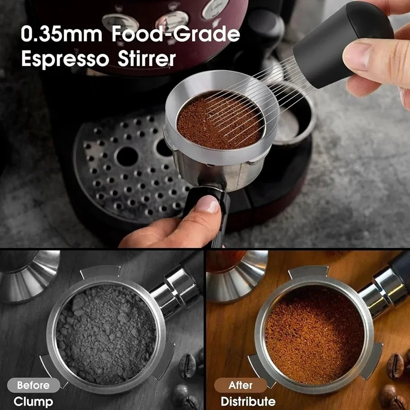 2,Espresso WDT Tool: Eliminate clumps and channeling with ultra-thin 0.35mm stainless steel needles. This precision tool creates a flawlessly even coffee bed, unlocking richer flavors and silky-smooth espresso shots. Pair it with the 2-in-1 Distributor & Tamper for unbeatable extraction consistency.