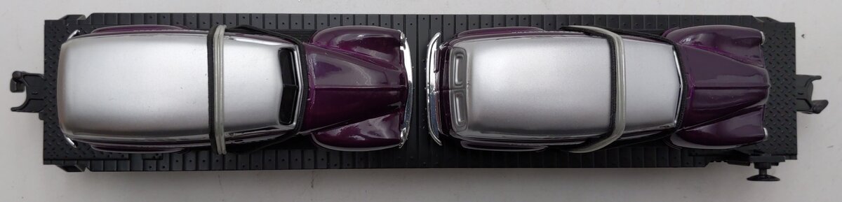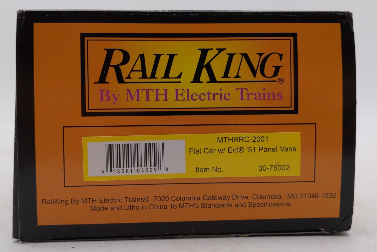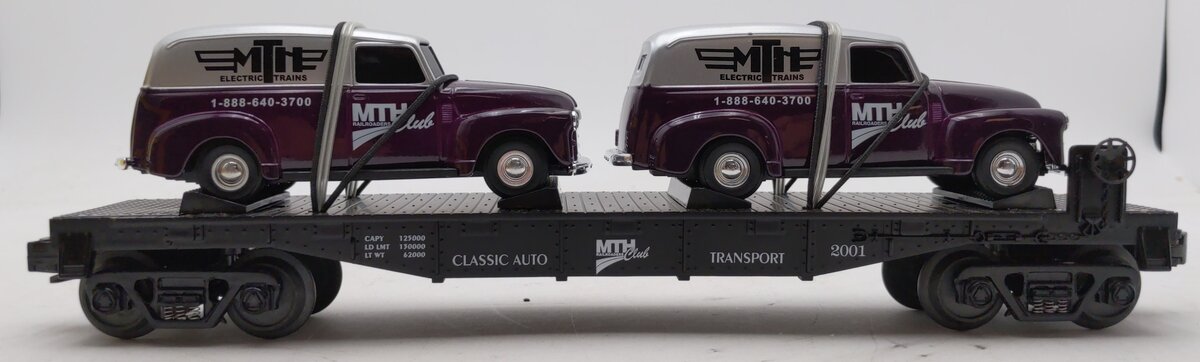 Here is a MTH 30-76002 O Gauge MTH RRC-2001 Flatcar w/2 Ertl 1951 Panel Vans. This car features die-cast metal sprung trucks, die-cast metal operating knuckle couplers, and metal wheels and axles. It will run on O-31 track.