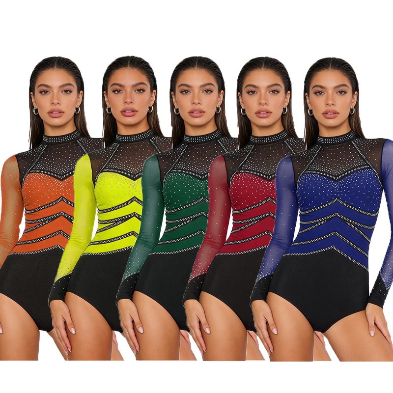 Sheer mesh patchwork design leotard with rhinestones that sparkle under the light to brighten up any performance.
