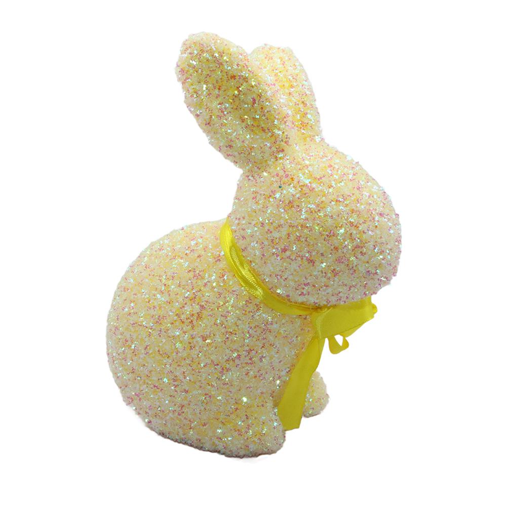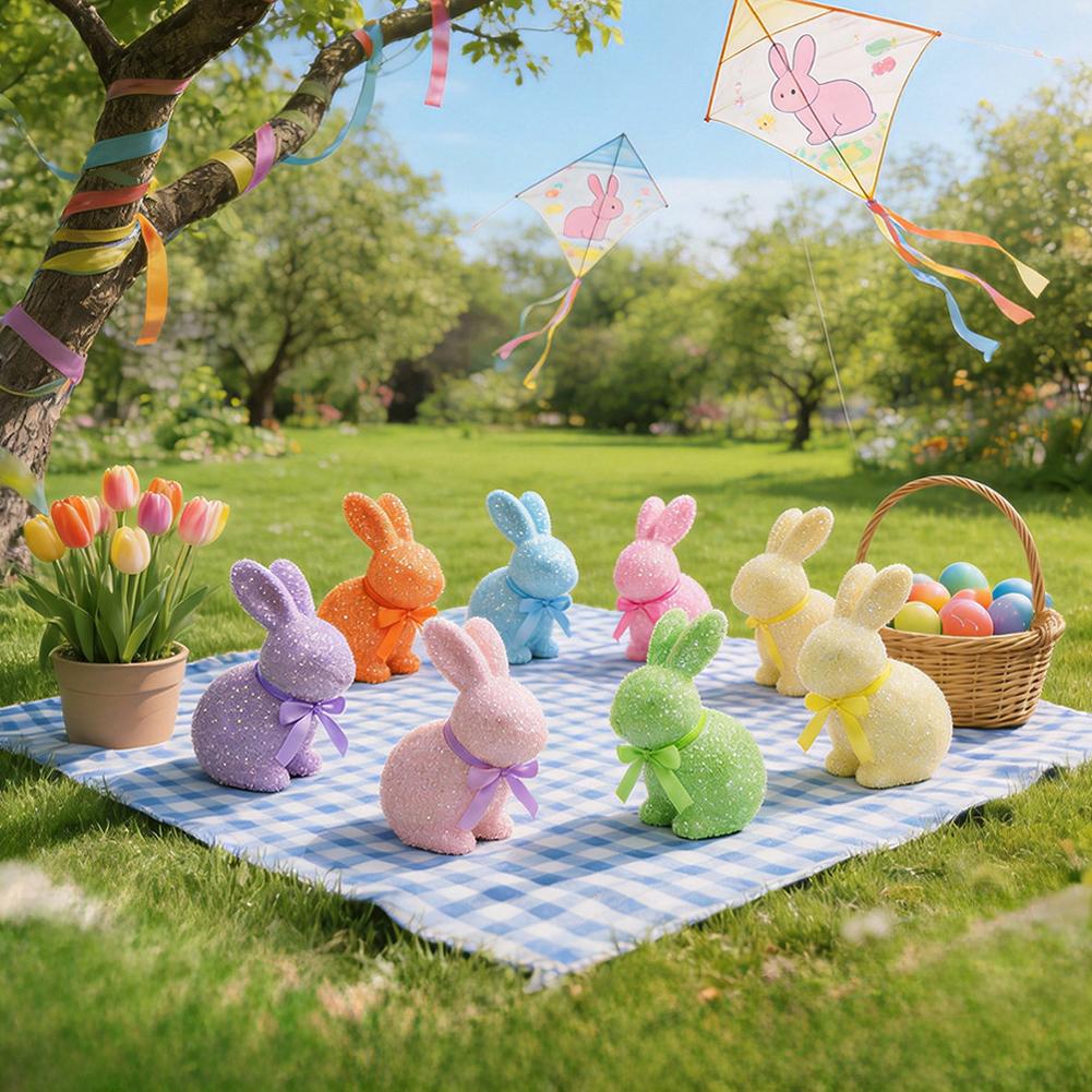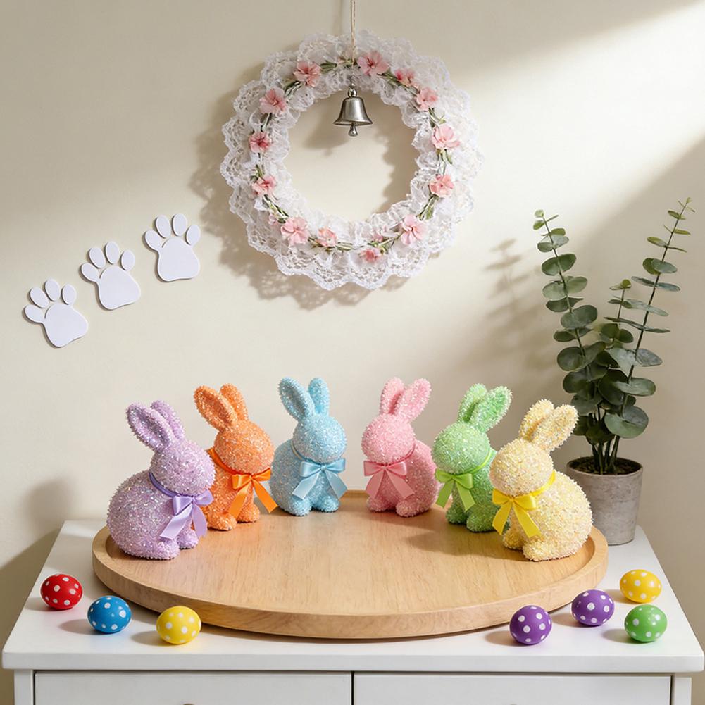 2. Sparkling and Colorful Design: This bunny ornament is made of flocked material and inlaid with glitter, available in a variety of vibrant colors, and features a matching bow around its neck. The adorable bunny shape and sparkling texture perfectly match the Easter theme, adding a festive atmosphere to your space.