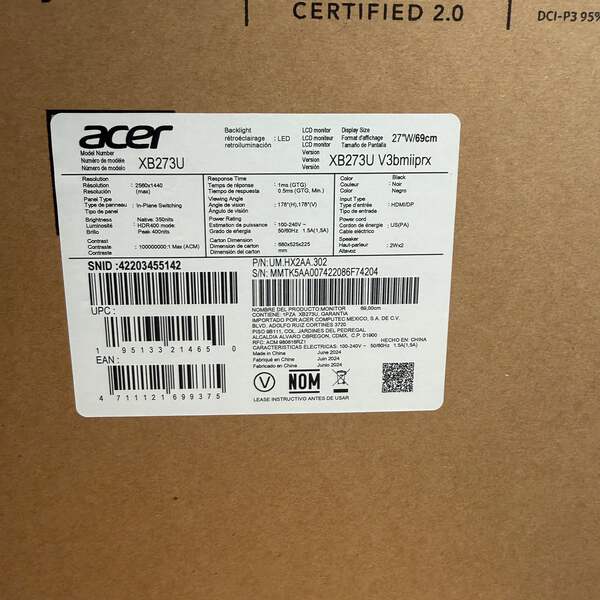 Acer Predator Monitor xb273u 27inch 2560x1440 165Hz