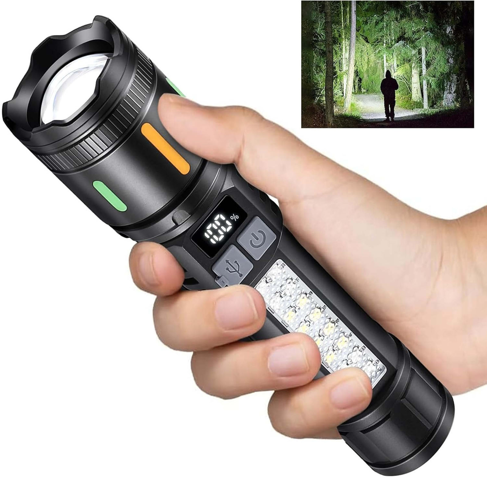3000 Lumens Super Bright Flashlight: Equipped with upgraded aggregative laser chips, Rechargeable flashlight emits a stable and super bright lighting. As a bright flashlight with a solid and powerful maximum brightness of 3000 lumens and very suitable for home, camping, hiking, outdoor or emergency situations. etc