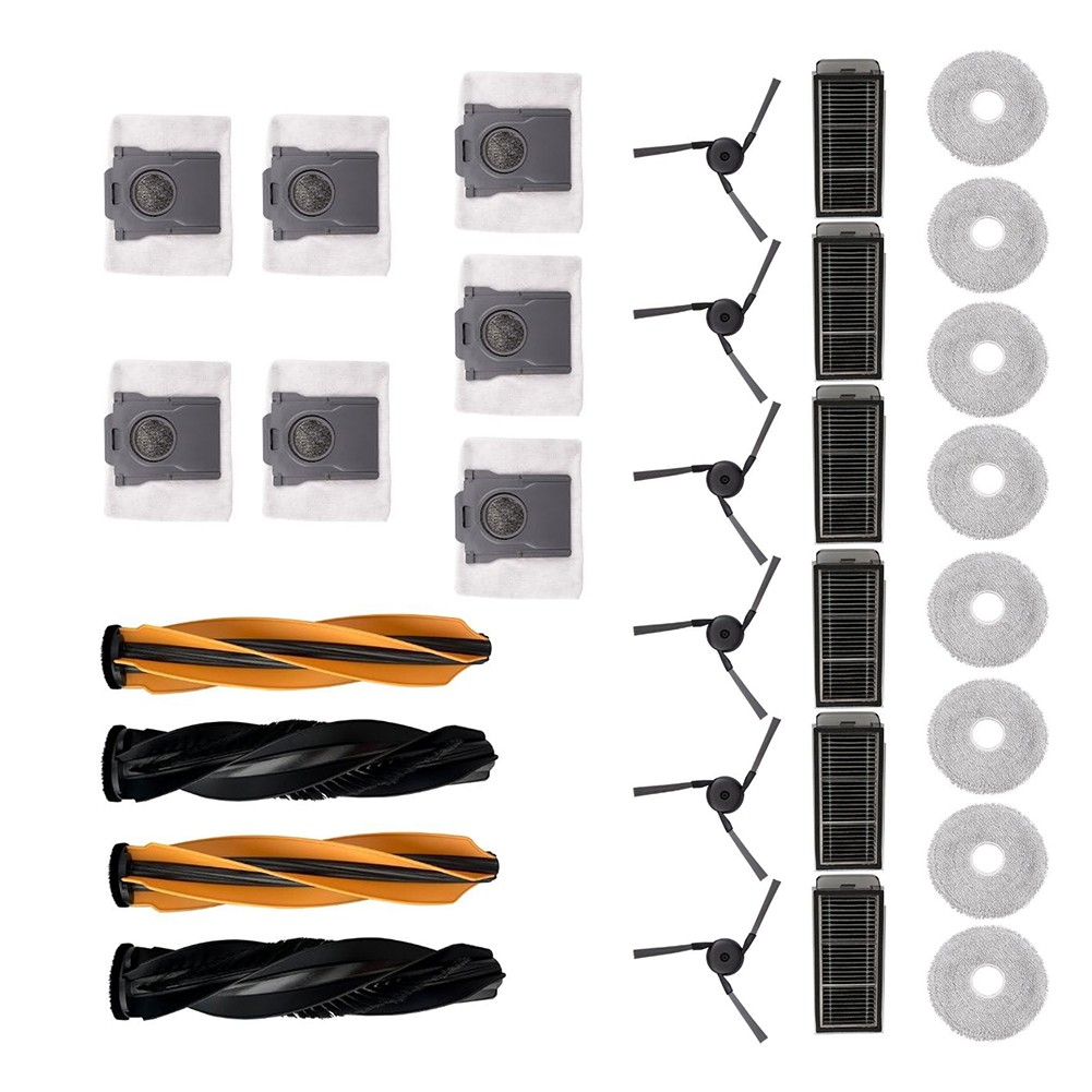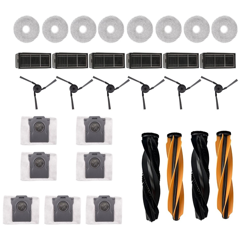 8 tampons de vadrouille, 7 sacs à poussière, 6 brosses latérales, 6 filtres, 4 brosses principales