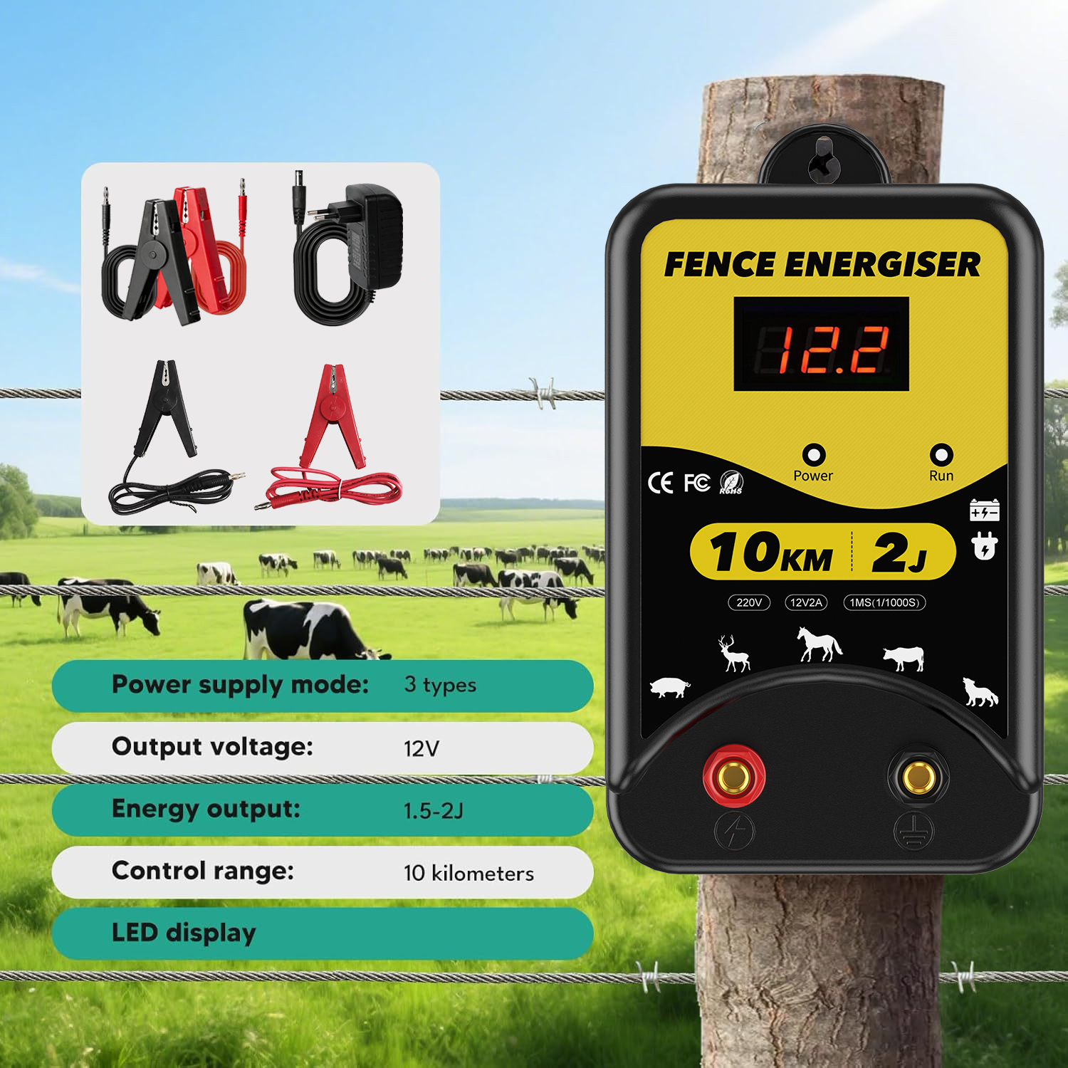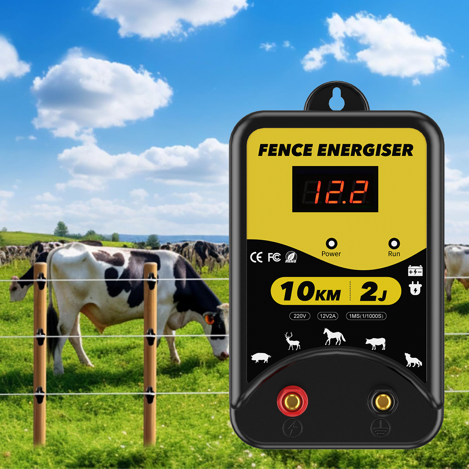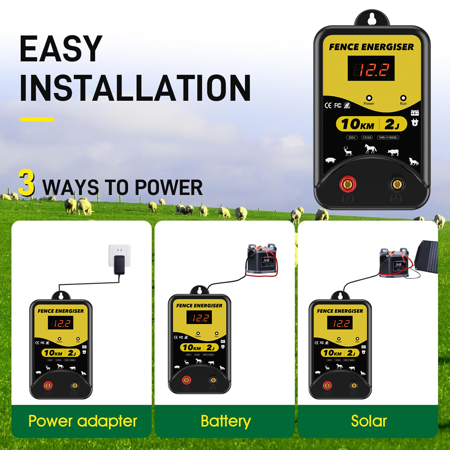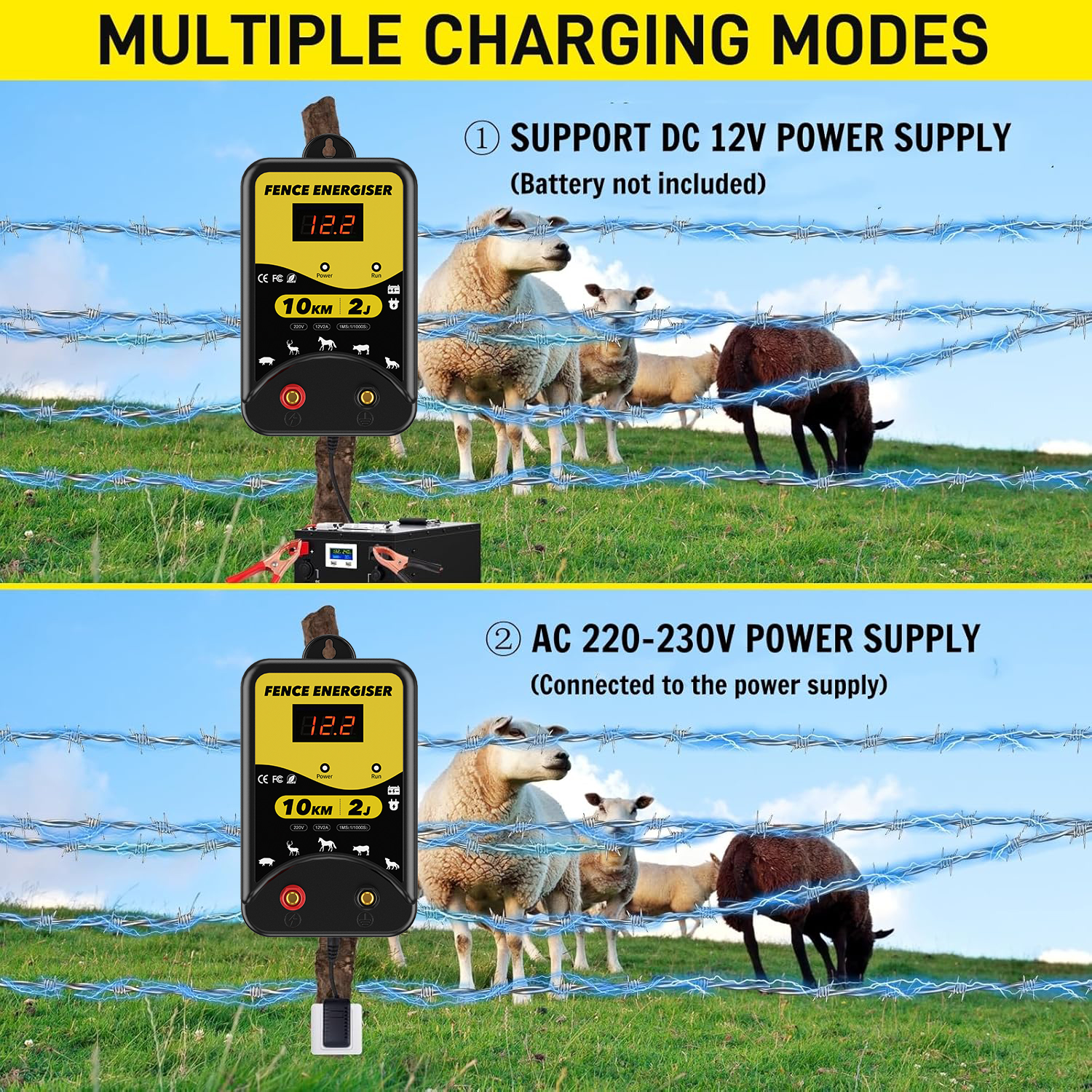 ✅【3 Power Options】Our electric fence energizer offers 3 power supply options: 220-230V AC power, DC 12V battery or solar power. (Note: Solar panels and batteries are NOT included). The LED display clearly shows the input voltage, and 3 indicators (power, shock, fault) allow you to monitor the fence's status.