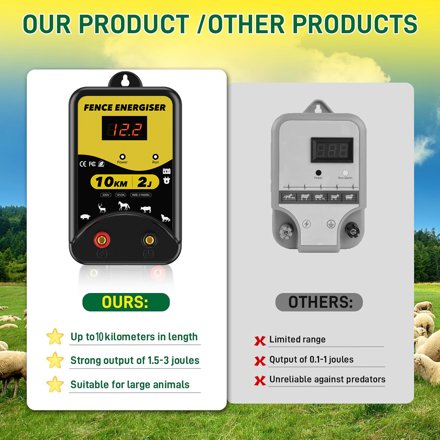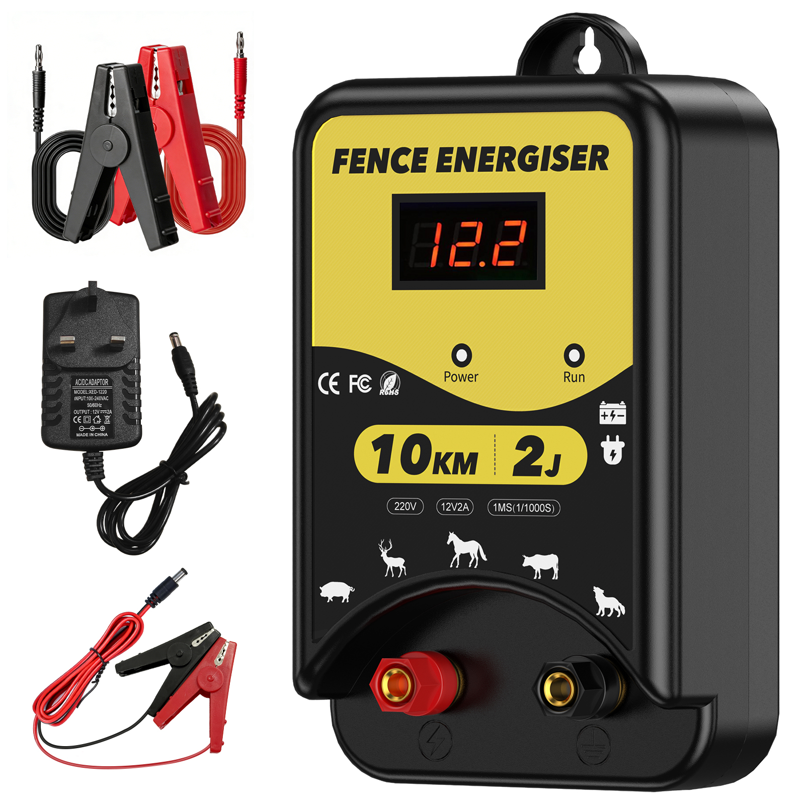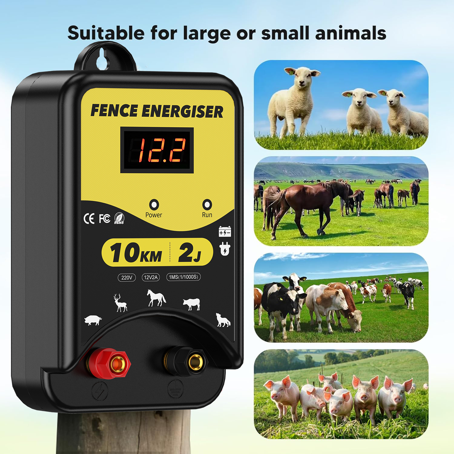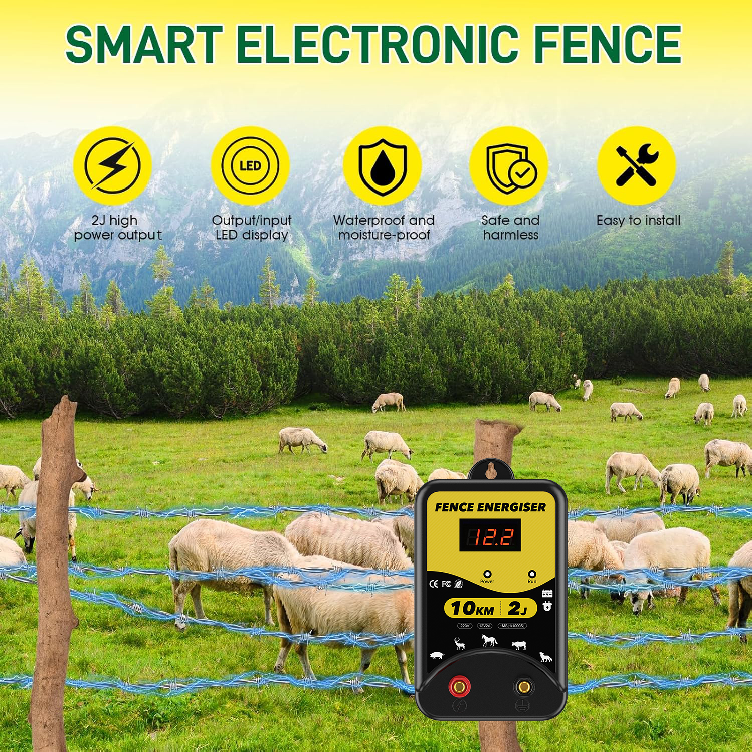 ✅【3 Power Options】Our electric fence energizer offers 3 power supply options: 220-230V AC power, DC 12V battery or solar power. (Note: Solar panels and batteries are NOT included). The LED display clearly shows the input voltage, and 3 indicators (power, shock, fault) allow you to monitor the fence's status.