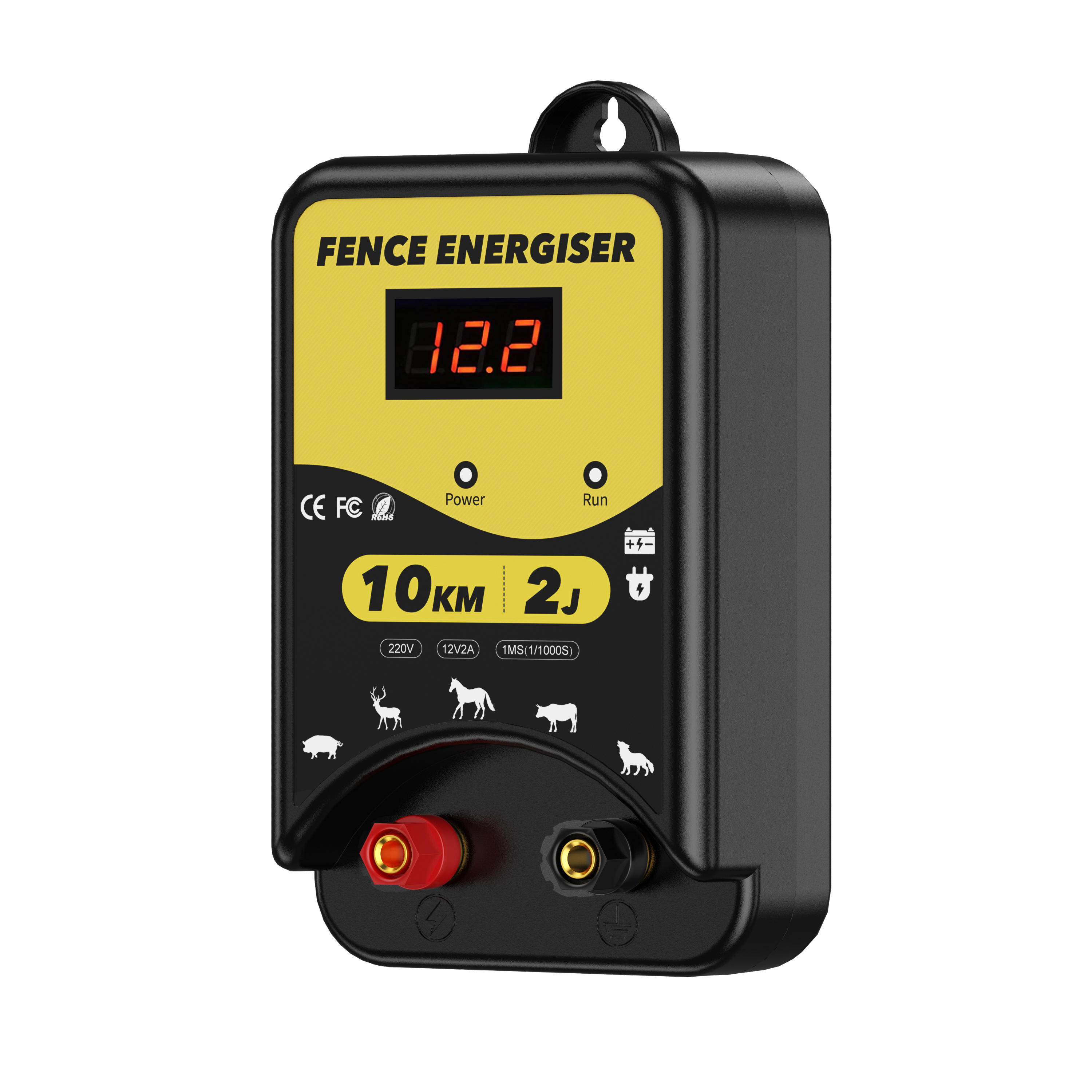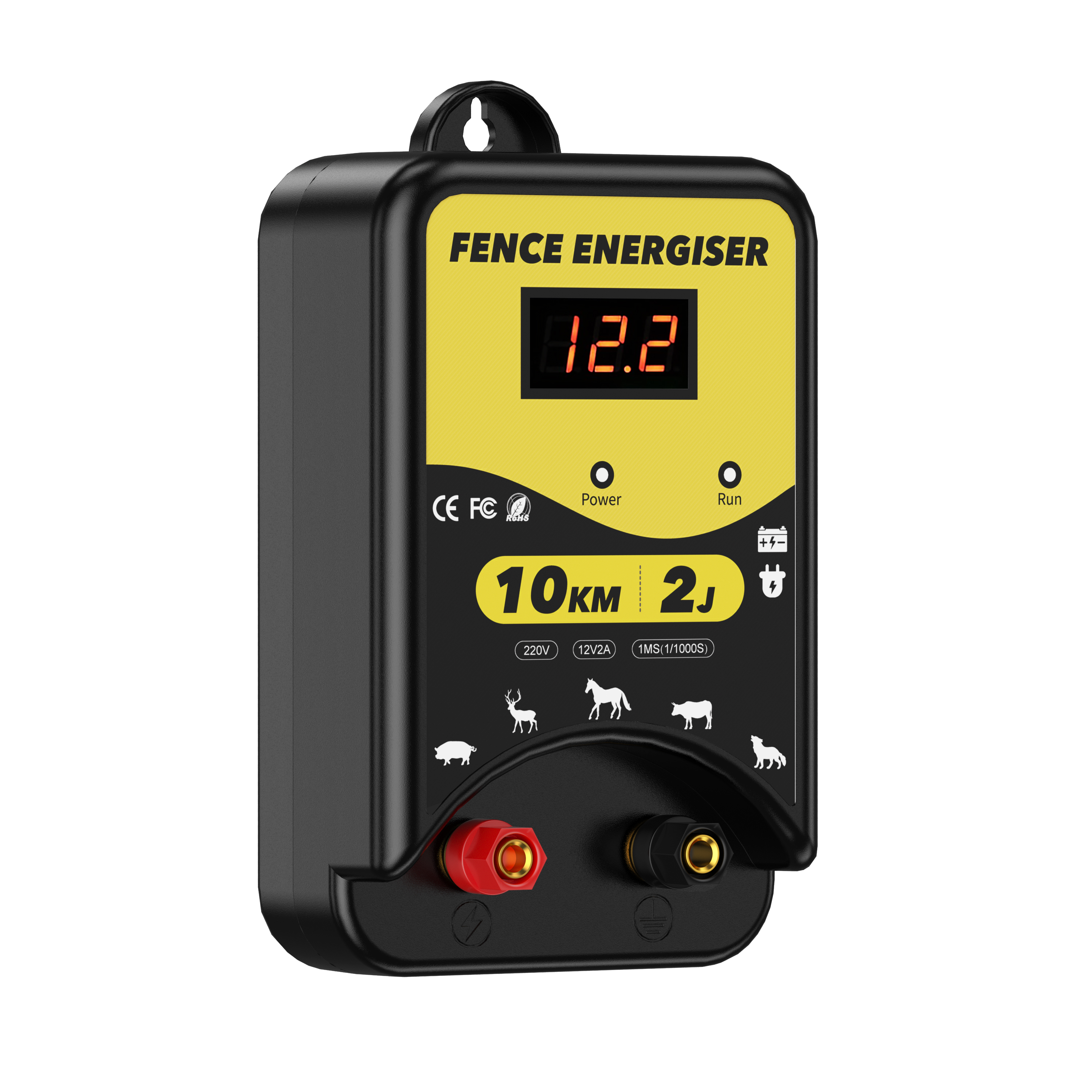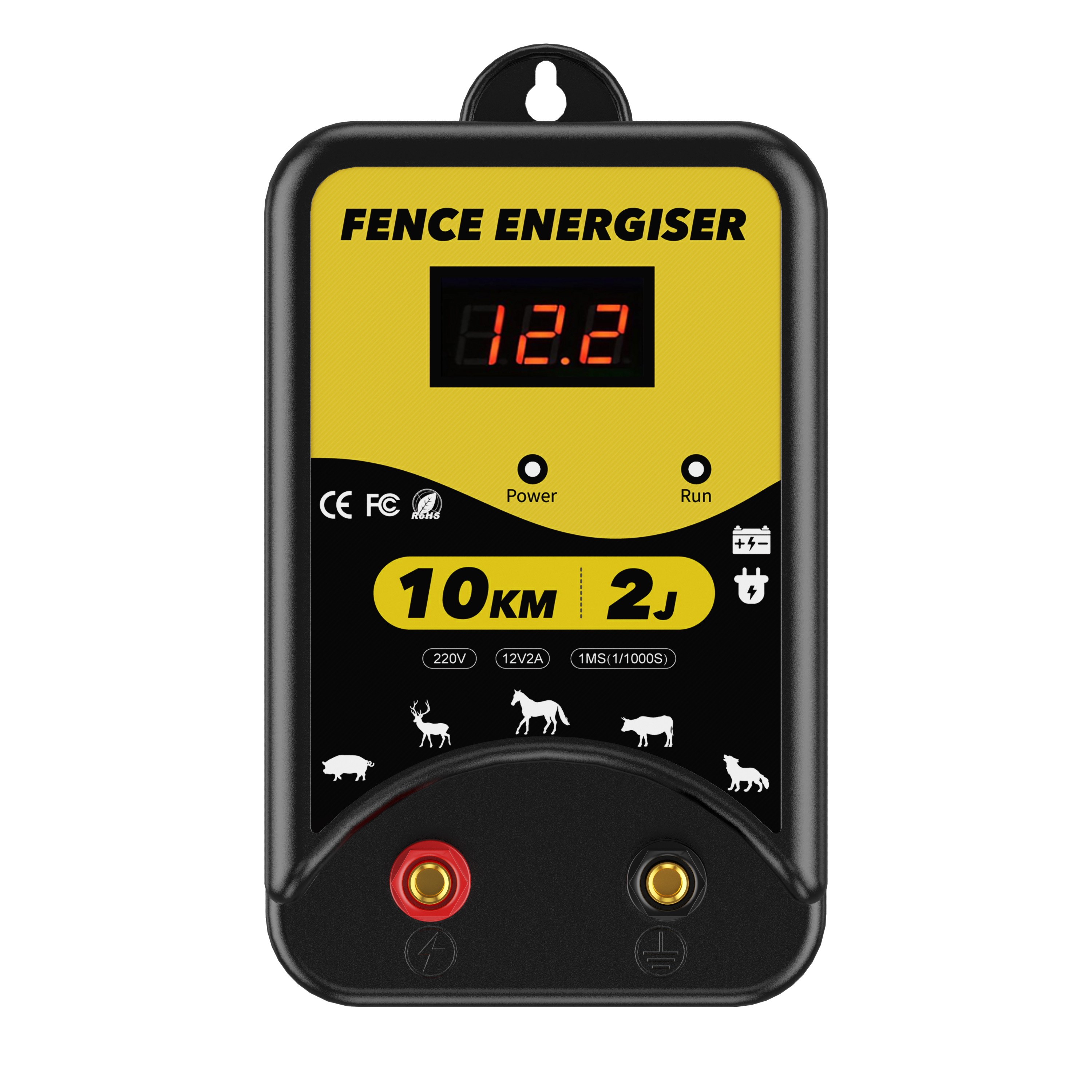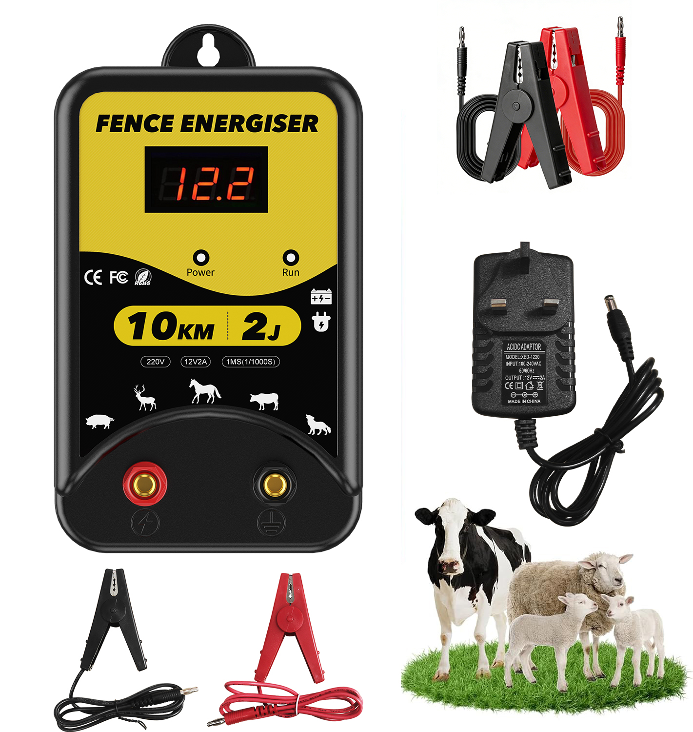 ✅【3 Power Options】Our electric fence energizer offers 3 power supply options: 220-230V AC power, DC 12V battery or solar power. (Note: Solar panels and batteries are NOT included). The LED display clearly shows the input voltage, and 3 indicators (power, shock, fault) allow you to monitor the fence's status.