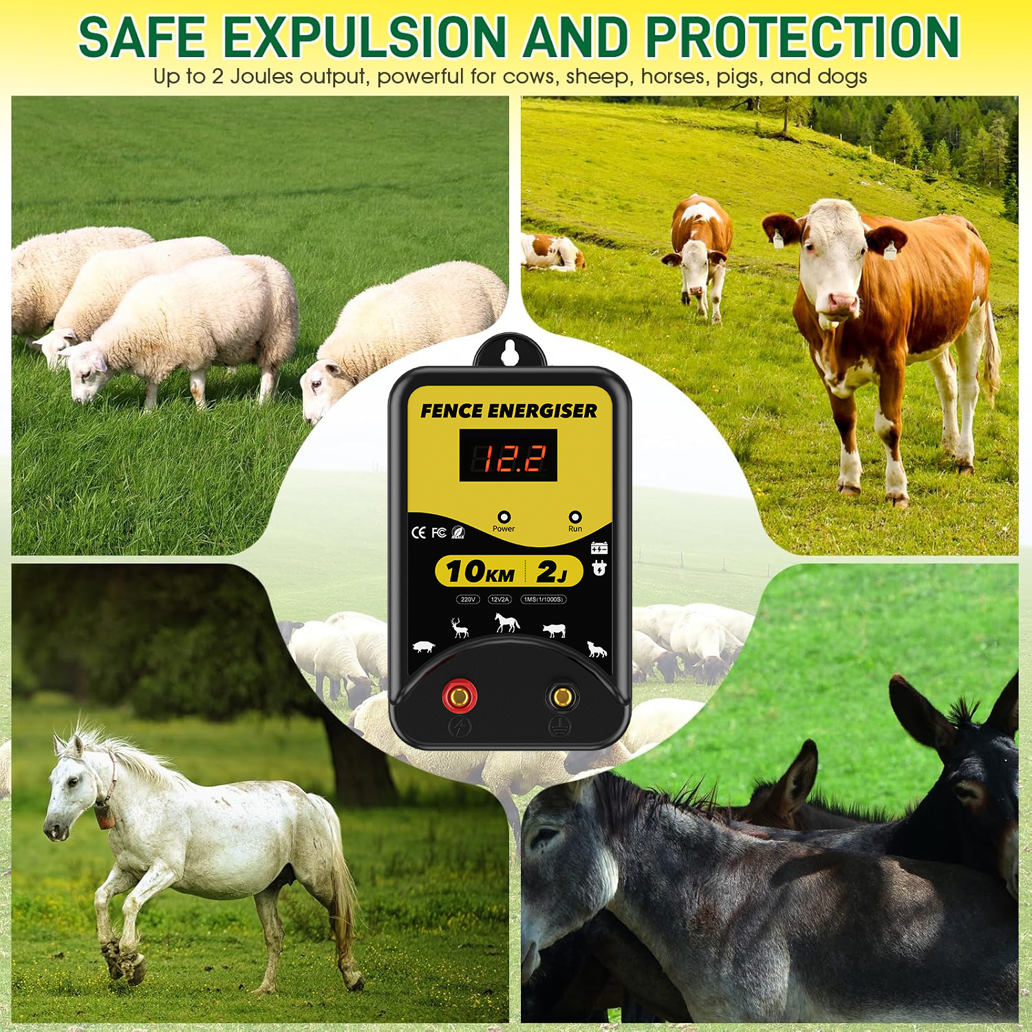 ✅【10KM Control Range】Featuring 1.5-2J of high output, the electric fence energizer efficiently controls large animals like cows, horses, and goats over a wide control range of up to 10km. The pulse voltage only has a deterrent effect and does not pose a threat to humans or animals.