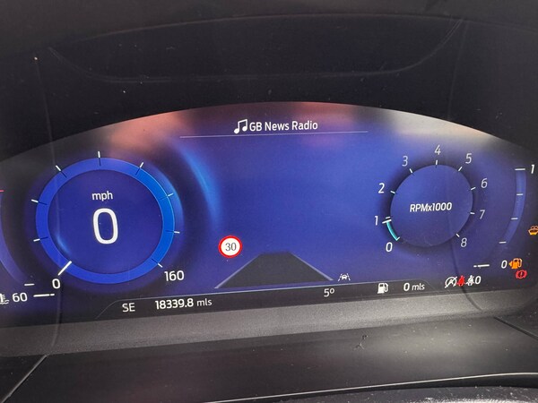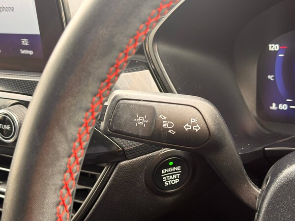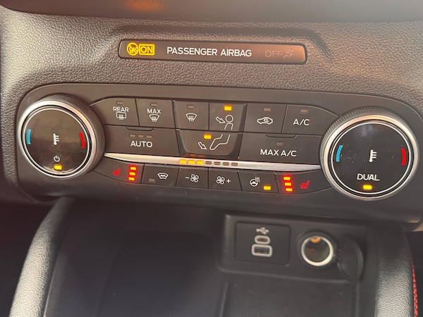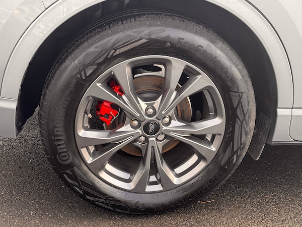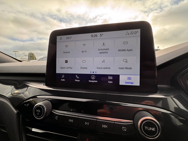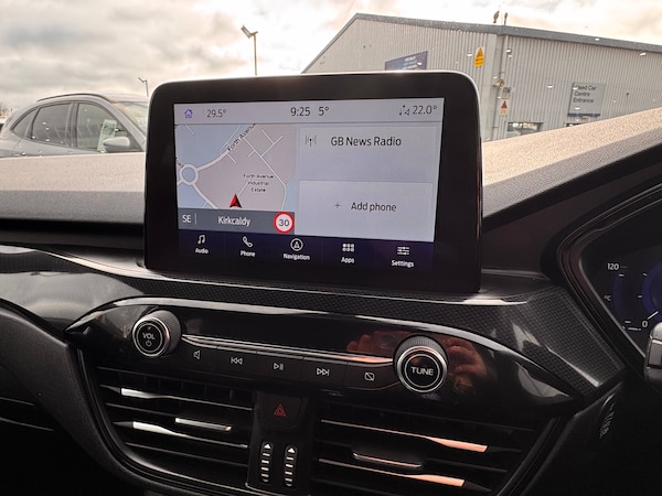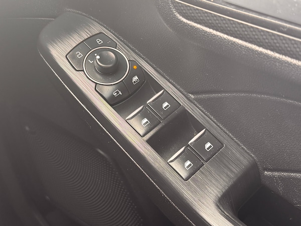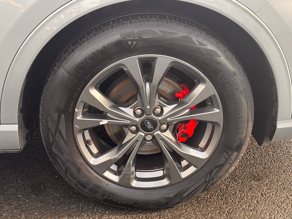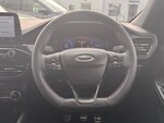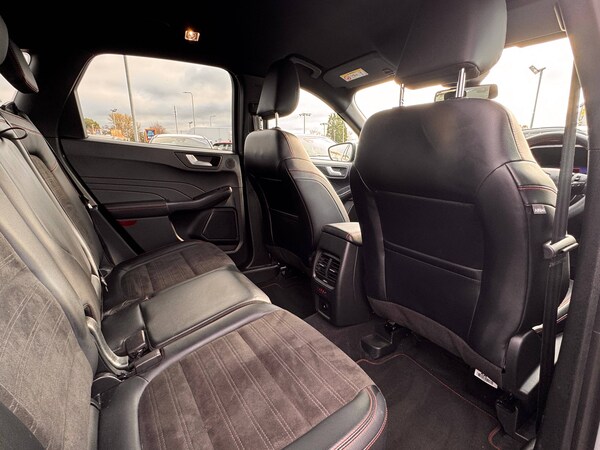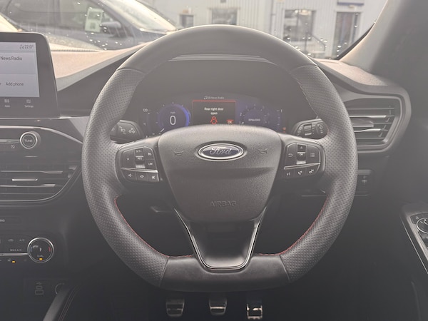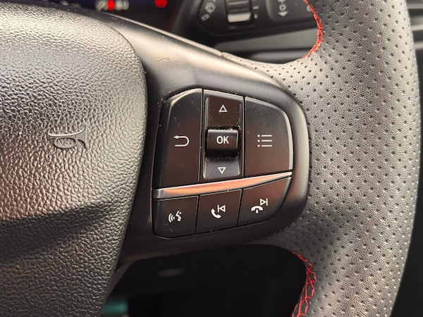 3x3 point rear seatbelts, Airbags - front driver/passenger, front and rear curtain, Drivers knee airbag, Electronic stability control (ESC) and ABS, Ford MyKey Gen 2 safety system, Manual child proof rear door locks, Post collision braking, Pre collision assist with autonomous emergency braking, Rear seat Occupancy alert, Red brake calipers, Tyre pressure monitoring system, 12.3 inch digital colour instrument cluster, Cruise control with adjustable speed limiter, Ford easy fuel, Ford SYNC 3 with 8 inch TFT LCD touchscreen, App Link, andriod auto/apple carPlay, emergency assistance and navigation with Ford pass connect, Front and rear parking sensors, Hands free power tailgate, Lane keeping aid with lane departure warning, Power assist steering, Rear view camera, Selectable drive modes, Service interval indicator, Auto headlamps with high and low beam, Black roof rails, Body colour bumpers, Day/night rear view mirror, Front LED fog lamps, Full LED headlamps, Large rear roof spoiler, LED daytime running lights, LED rear lights, Power folding, electrically adjustable and heated door mirrors with puddle lights, Power front/rear windows with global close, Quickclear heated windscreen, Rain sensing wipers, Rear privacy glass, Rear side wing doors, Rear wiper, Solid paint, ST Line body styling kit with unique front and rear fascia and bumper, rear painted diffuser, front painted skid plates, dark mesh upper grille, ST Line front scuff plates, Third brake light, Twin exhausts, 10 way power adjustable drivers seat, 8 way manual passenger seat including lumbar support and height adjust, Alloy pedals, Centre console with electronic parking brake, Dark headlining and pillars, Electronic automatic temperature control (EATC), Flat bottomed leather steering wheel in sensico with red stitching, Front and rear head restraints, Partial premium touch Sensico with black cloth inserts and red stitching, Rear centre head restraint, Single front passenger seat, Sports seats, ST Line front and rear floor mats, ST Line gear knob, Sports suspension, Twist beam rear suspension, Engine immobiliser, Keyless entry and Ford power start button (Keyless start), Locking wheel nuts, Remote powered central double locking doors, Thatcham category 1 alarm, BandO premium audio system with 10 speakers and subwoofer, 2 USB ports, DAB radio/CD, 18 inch 10 spoke rock metallic alloy wheels, Tyre inflation kit