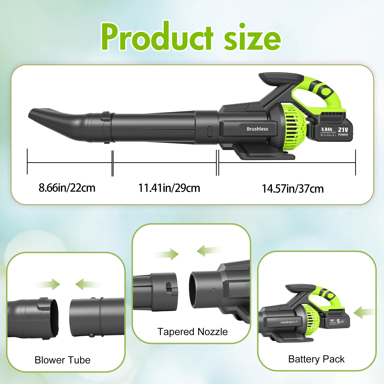 💪【Quick Assembly, Ergonomic Design & Easy Storage】 – Designed for user convenience, this battery leaf blower features an ergonomic handle for comfortable use and can be assembled in minutes without tools. The detachable tubes make storage simple in your garage, shed, or even a car trunk.✅【2-in-1 Blower & Vacuum Versatility】Experience the dual power of blowing and vacuuming! This versatile tool isn't just for autumn leaves; it's ideal for indoor dusting, quick cleanup jobs, and even helping to start your barbecue fire. A must-have, practical solution for countless household, yard, and workshop needs.🌟【Lightweight & Robust, Easy to Handle】Designed for comfort, the body is made of high-grade ABS engineering plastic, achieving a remarkable lightweight build of just ~1.8kg without sacrificing strength. This thoughtful design makes it easy for anyone to use single-handedly, reducing fatigue during long sessions. Its high strength and insulating properties ensure safe operation, making yard work surprisingly easy.💌Tip: If there have any problems with the product, please let us know. We are on standby 24/7 to solve your problem.