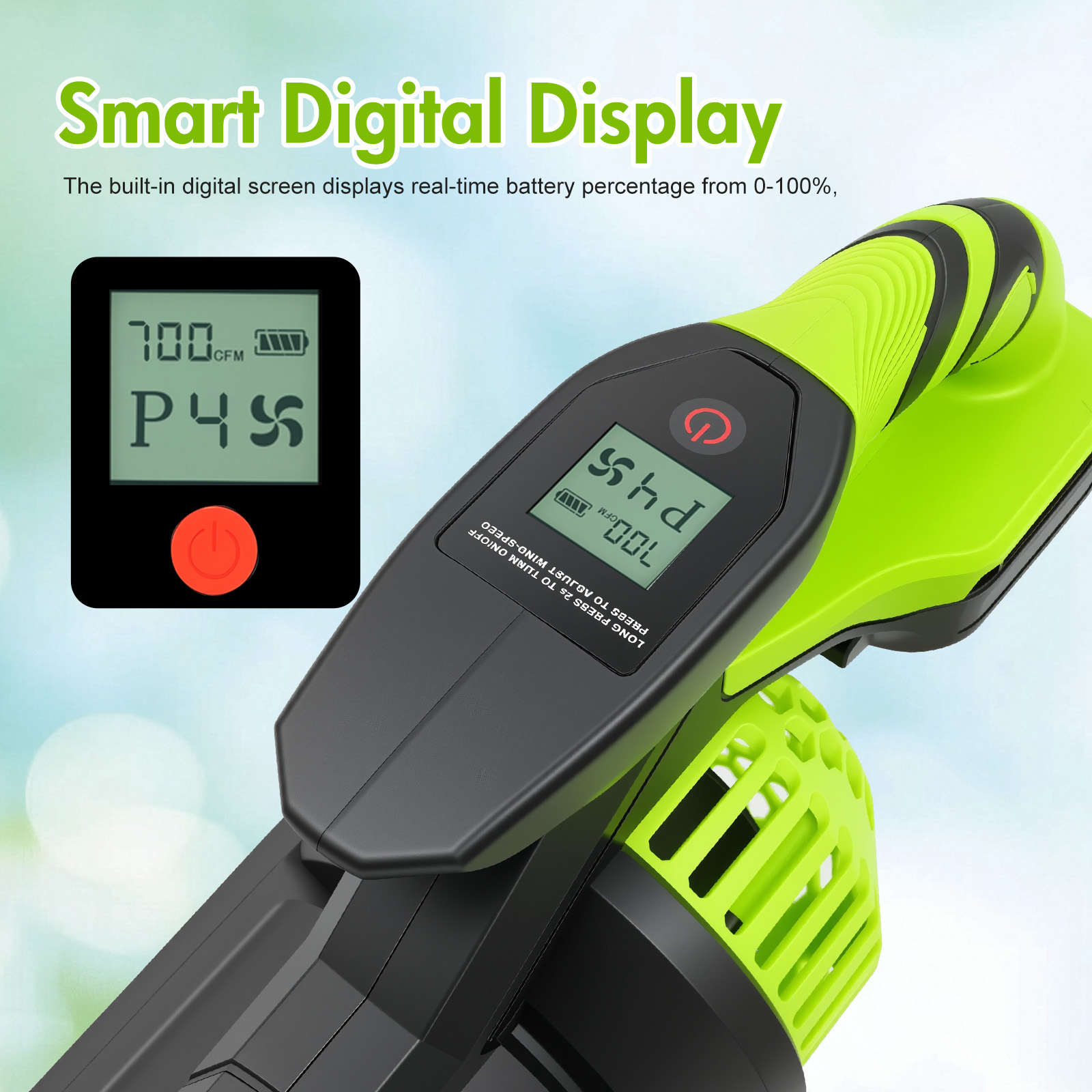 👍【 Exclusive LCD Display 】– This electric leaf blower cordless features a full LCD screen that clearly shows wind speed, gear level, and battery status in real time, giving you precise control and maximizing efficiency for your cordless leaf blower, lawn blower, and yard cleanup.