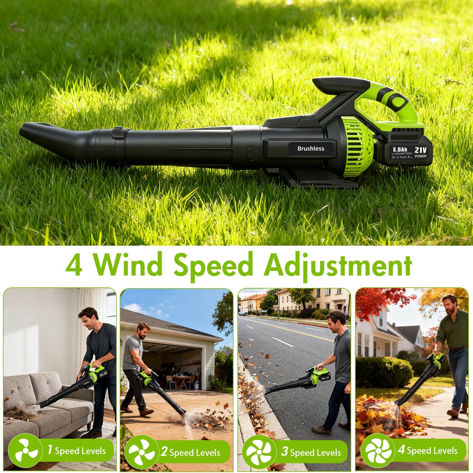 ⚡【 4-Speed Adjustable Control】 – Tailor the airflow with three precise speed settings, from a light breeze for clearing dust off patios and decks to a powerful blast for wet leaves or stubborn debris. This leaf blower cordless with battery and charger offers the control you need for efficient, versatile yard and garden cleanup.