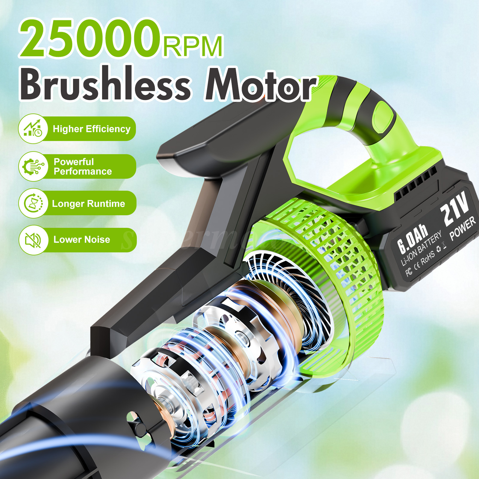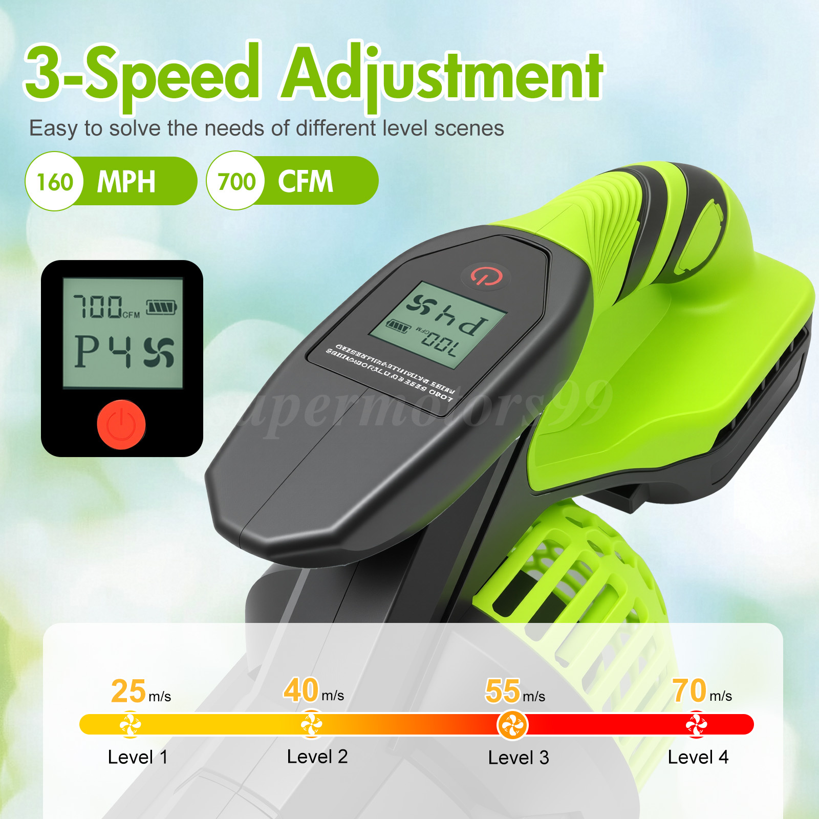 💨【 High-Performance Motor】 – Equipped with an upgraded high-performance motor running at 25,000 RPM, this battery powered leaf blower delivers powerful air speeds up to 160 MPH and a maximum air volume of 700 CFM, making quick work of leaves, debris, dust, and light snow.
