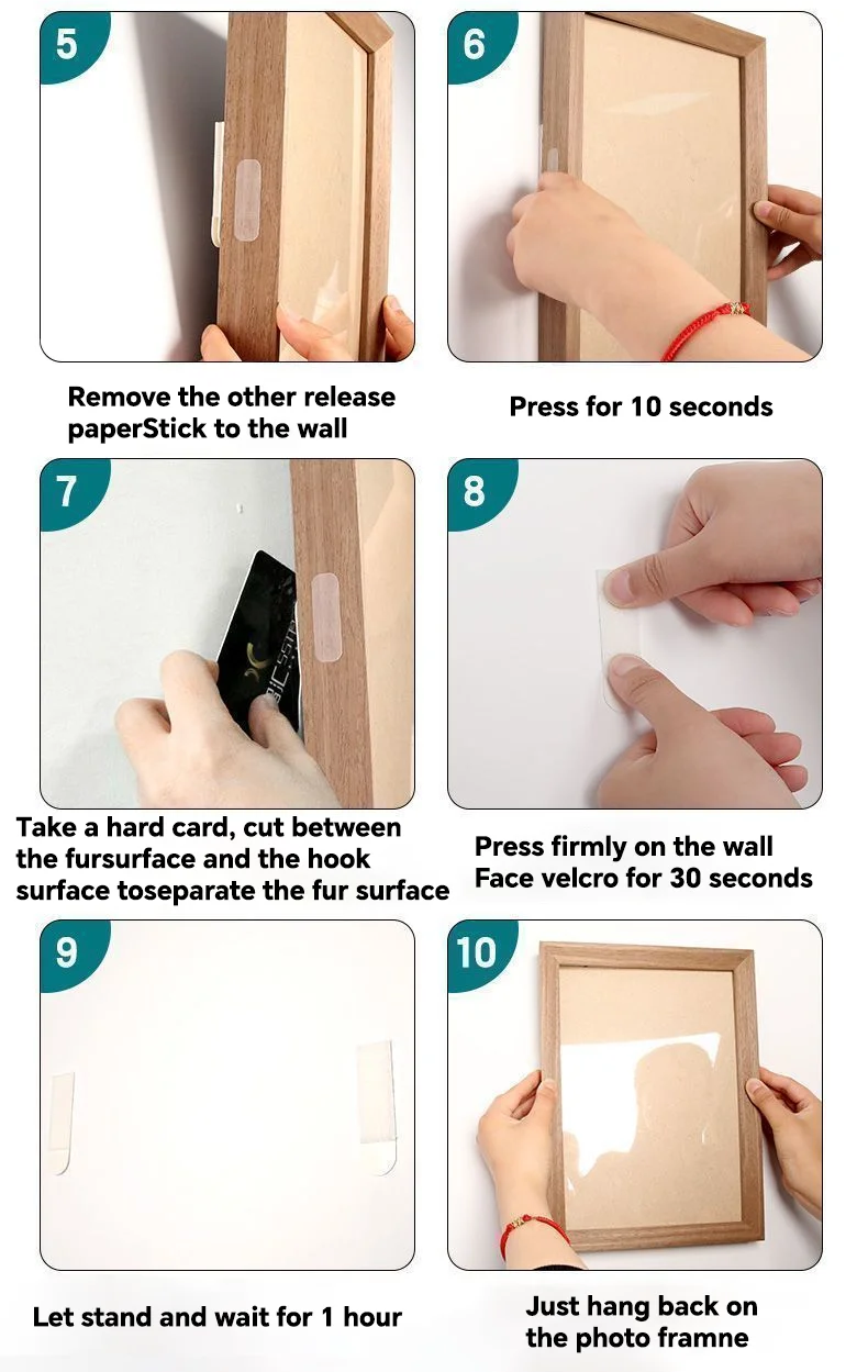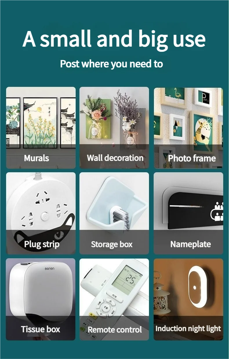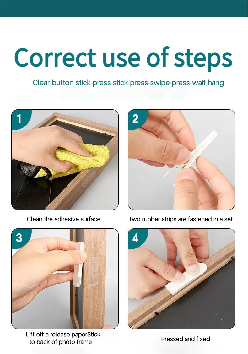 3. Suitable for most smooth surfaces: Adhesive wall hanging strips are suitable for various smooth surfaces, including finished wood (painted or lacquered boards, cabinets or doors), glass, tiles, metal, laminates, plastics, etc.