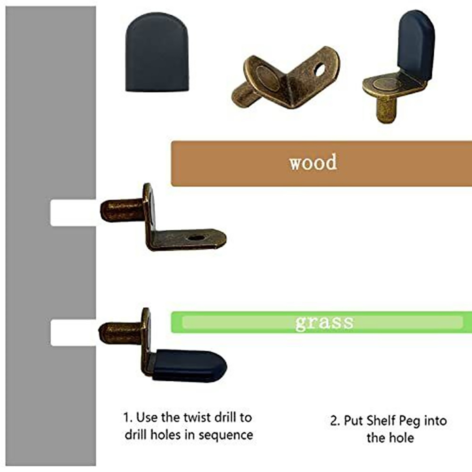 Use Steps: 1. Ues a electric drill to punch, please use the 6mm bit. 2. Put the shelf pin into the hole. 3. If the diameter of the hole is bigger then the shelf pin, you can wrap a circle around it. 4. Place the baffle on the shelf pin. 5. Warm note: small parts, please keep away from child.