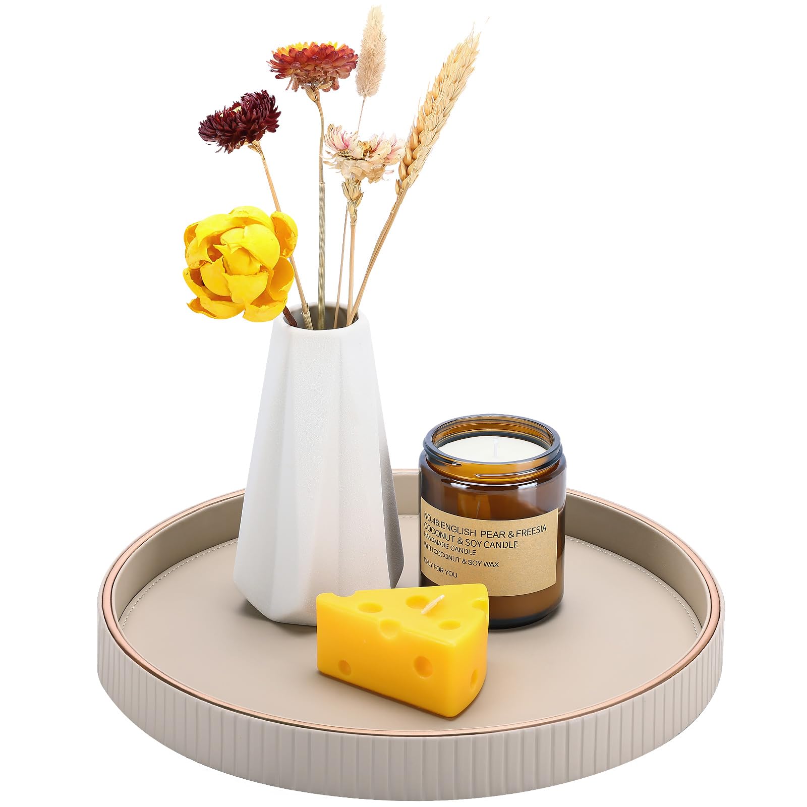 Crafted from premium PU leather with an elegant vertical stripe texture, this 11.8-inch diameter tray features a luxurious gold trim that adds a touch of glamour to any setting.