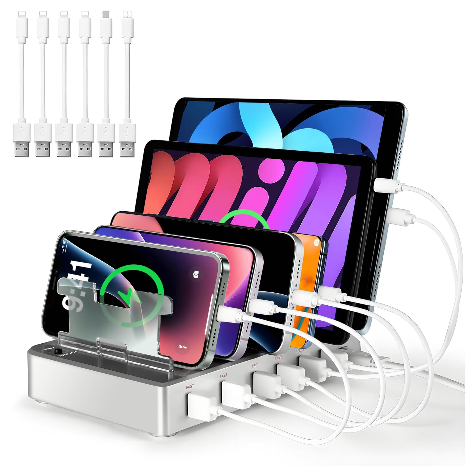 300W Charging Station for Multiple Devices, Fast Charging 6 Port Charging Station - Compatible with iPhone iPad Android Tablets, Home Office Travel Organizer