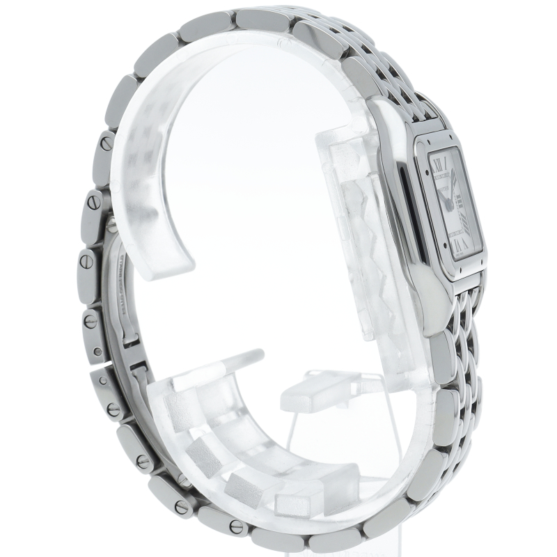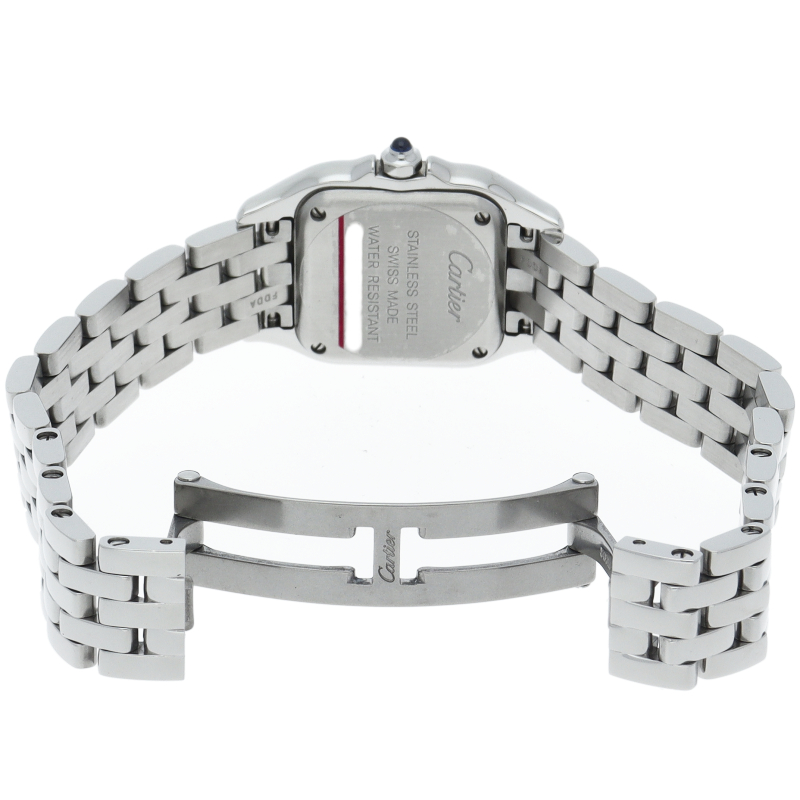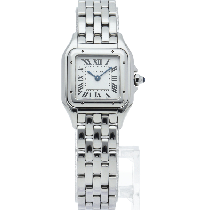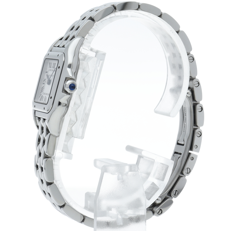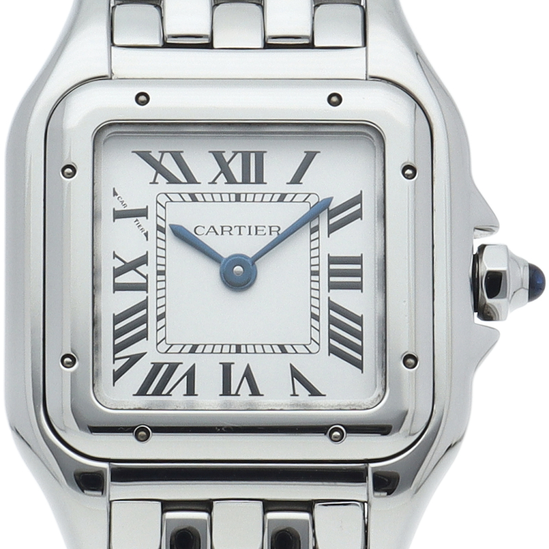 | Cartier "PANTHERE de Cartier" SM (WSPN0006). This Reprint Design model is a modern rebirth of an 80s icon. The supple bracelet boasts an exceptional fit, making it feel like jewelry. The mirror-finished stainless steel and square case radiate a sophisticated shine, making this a timeless classic that graces any woman's wrist. |