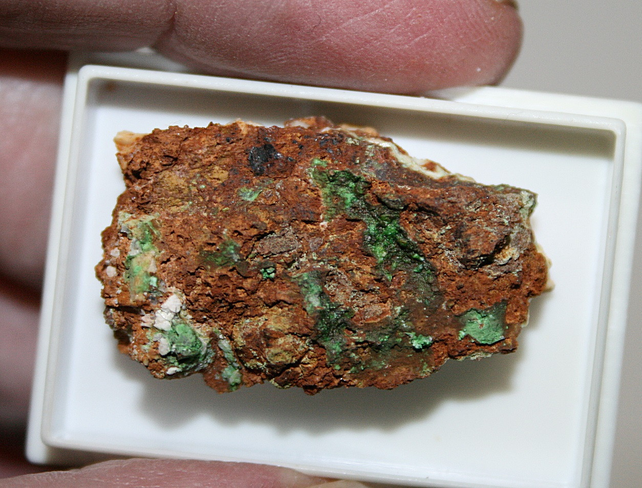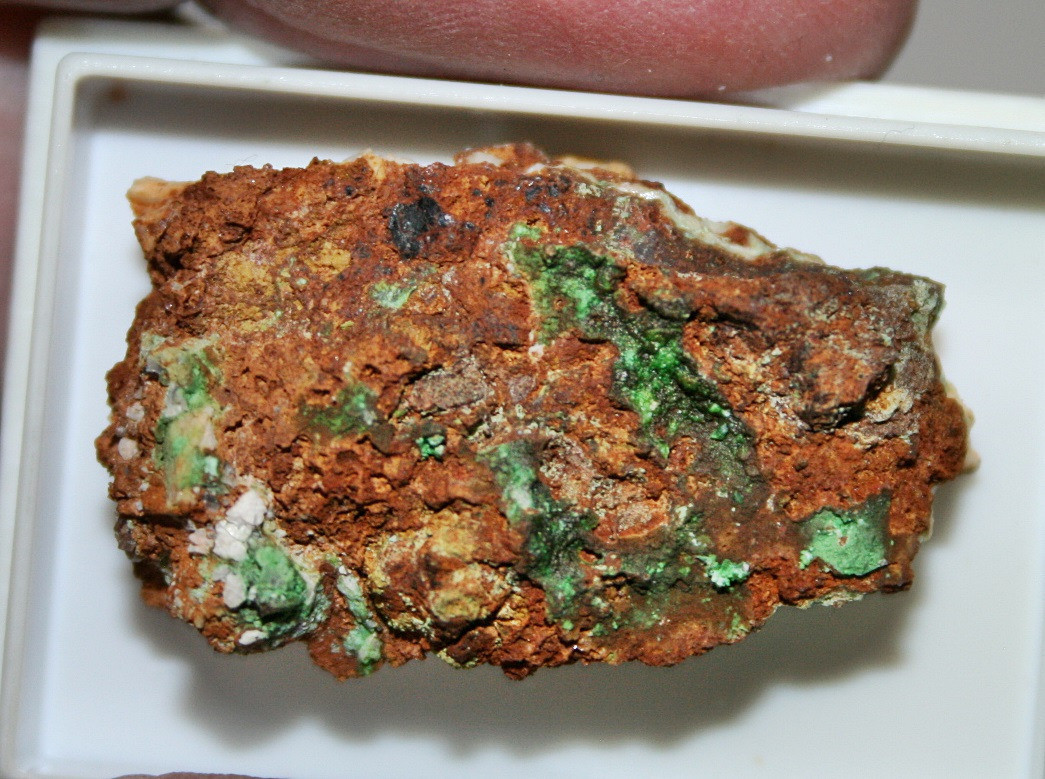 Selten Konichalcit , Schmiedestollenhalde , Wittichen , Schwarzwald Mineralien . Das Stueck stammt aus einer Sammlungsaufloesung und ist in einer 4cm x 3cm x 2cm grossen Dose . Die Aufnahmen wurden bei Tageslicht gemacht Farbabweichungen sind möglich . Zum betrachten ist eine Lupe oder Mikroskop nötig .